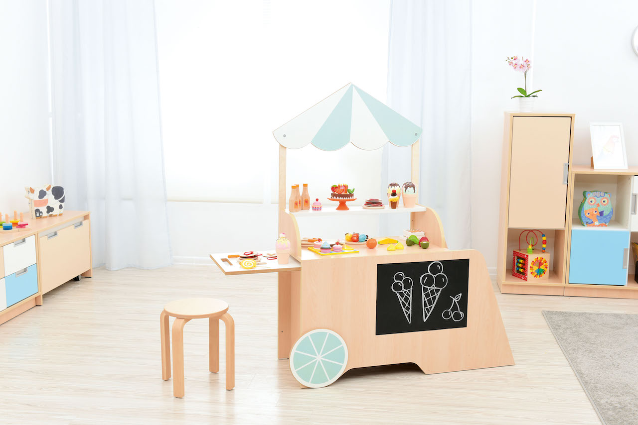 IJssalon met uitschuifbaar plateau uitgevoerd in berken decor 18 mm.