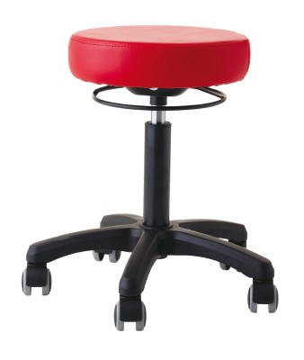 Taboeret met kunstlederen zitkussen is in hoogte verstelbaar door rondom bedienbare ring.