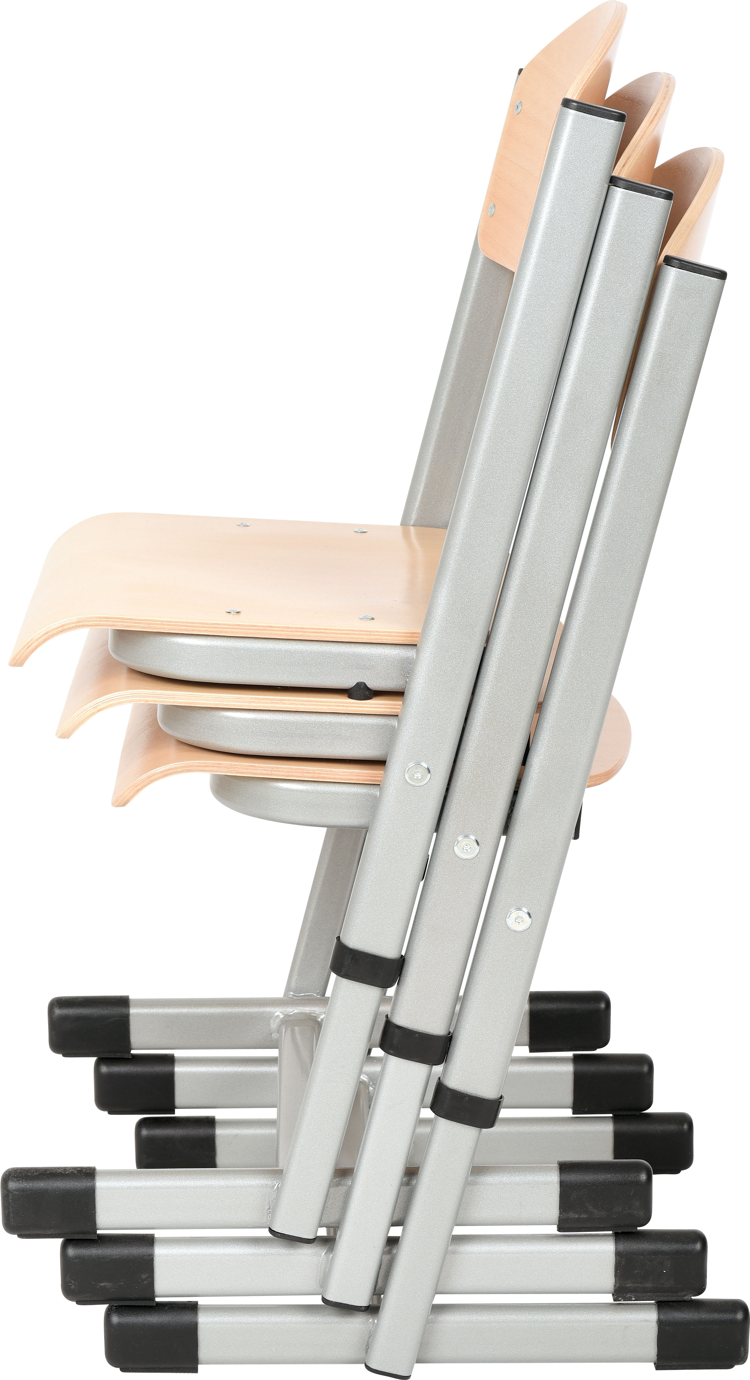 Stoelen zijn stapelbaar, in 3 hoogtes verstelbaar 38, 42 en 46 cm en het frame is verkrijgbaar in in 5 kleuren (rood, blauw, geel, groen en zilver)