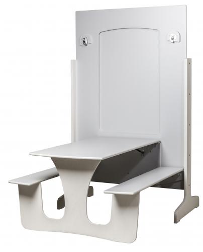 | 2 klaptafels die worden opgeklapt tegen het scheidingswand in het midden. Dubbelwandige klaptafel inclusief geïntegreerde banken op zijn eigen verwijderbare muur. Een snelle, elegante oplossing om 12 zitplaatsen te creëren. De tafel staat op 4 wielen, dus hij kan gemakkelijk worden opgevouwen en opgerold wanneer hij niet in gebruik is. Ruimtebesparend z. B. tijdens het spelen en schoonmaken. De tafel is gemaakt van 18 mm wit gepigmenteerd berken multiplex met lichtgrijs duurzaam laminaat op de tafel en banken, tegen een meerprijs zijn andere kleuren leverbaar. Geleverd met gasdempers die het gemakkelijker maken om de tafel omhoog en omlaag te brengen. Gewicht: 87 kg |