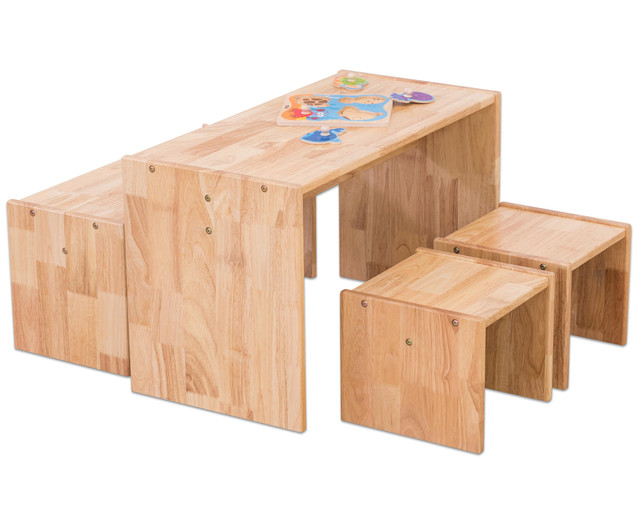 | Houten rubberboom zitgroep, 4 delen Duurzame set voor uw interieur De zitgroep van stevig rubberboomhout past perfect in elk interieur. In groepsruimtes kunt u in een oogwenk gezellige speel- en eetruimtes bouwen. Op twee krukken en een bank is geschikt voor maximaal 4 kinderen. De praktische tafel is ideaal voor groeps spellen, snackpauzes of schilder- en knutsellessen. Met de krukken en de bank kunt u de kinderen een comfortabel zitje geven. Ruimtebesparende opbergmogelijkheden dankzij verschillende hoogtes van de afzonderlijke elementen De zitgroep is de ultieme, ruimtebesparende oplossing voor uw instelling s: schuif de 4 meubels samen tot het volgende gebruik. Vuil kan gemakkelijk van het gladde oppervlak worden verwijderd met een vochtige doek. Dankzij de afgeronde hoeken bestaat er geen risico op letsel voor de kleintjes. Het zitmeubel kan in een mum van tijd worden gemonteerd dankzij de bijgevoegde montage-instructies. Rubberwood, of rubberhout, is afkomstig van rubberbomen. In eco plantages, voornamelijk in Zuidoost-Azië, wordt van deze bomen latex afgetapt om er rubber van te maken. Na 25 à 30 jaar valt de latexproductie stil, en is de plantage niet meer interessant. Vroeger werden plantages afgebrand en weer aangeplant. Intussen heeft men begrepen dat die rubberbomen nog een ander potentieel hebben. En dus worden ze gekapt en verwerkt tot meubelpanelen. Afval herbruiken, goede punten voor het vak ecologie! levering - 2 krukken (26 x 30 x 30 cm) - 1 bank (32 x 70 x 30 cm) - 1 tafel (48 x 80 x 40 cm) - Montage-instructies: Bouwpakket voor zelfmontage met bijgevoegde montage instructies. Gegevens & feiten te gebruiken: Leeftijd vanaf: 2 jaar textuur: Primair materiaal: Rubberboom hout Afmetingen / gewicht: Diepte: 40 cm Breedte: 80 cm Hoogte: 48 cm Totaal gewicht: 20.8 kg |