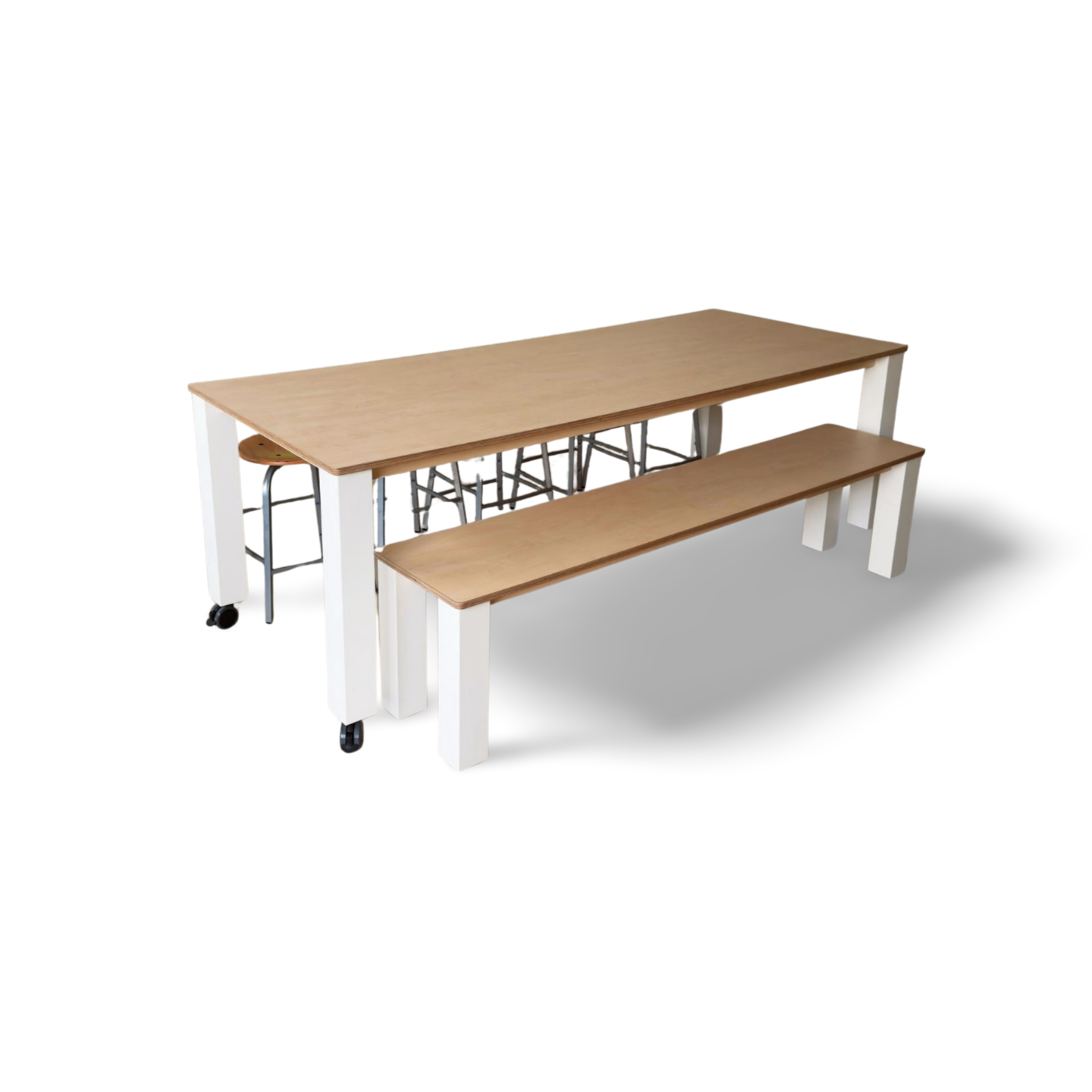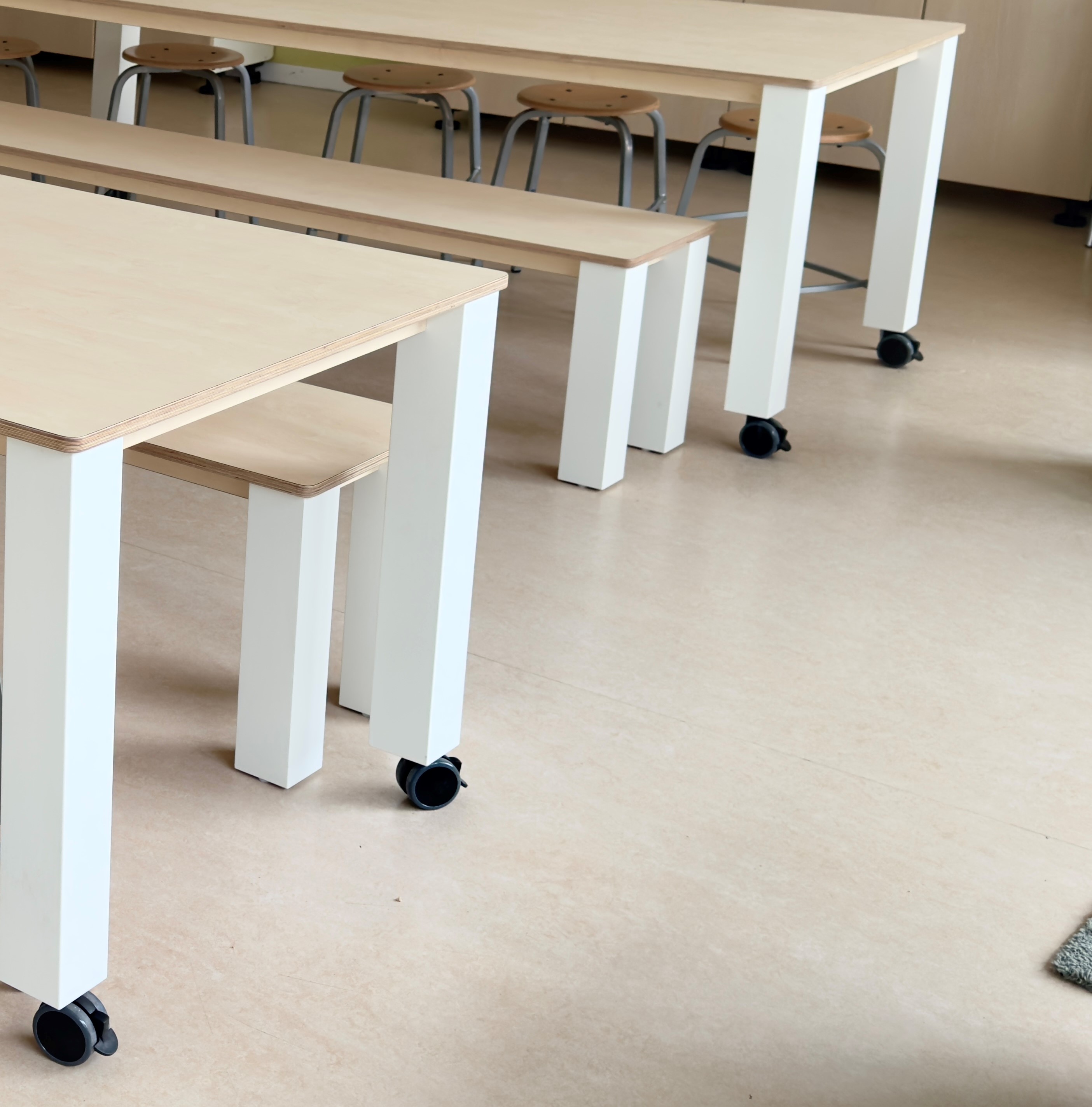 Robuuste bank L135 x B40 cm met rechte massief houten poten. Leverbaar in alle hoogtes. Het zitpaneel wordt standaard uitgevoerd in berken multiplex met een witte HPL toplaag. Onder de robuuste bank zijn massief houten poten gemonteerd. Robuuste bank L135 past tussen de poten van robuuste tafel 160 cm. |
