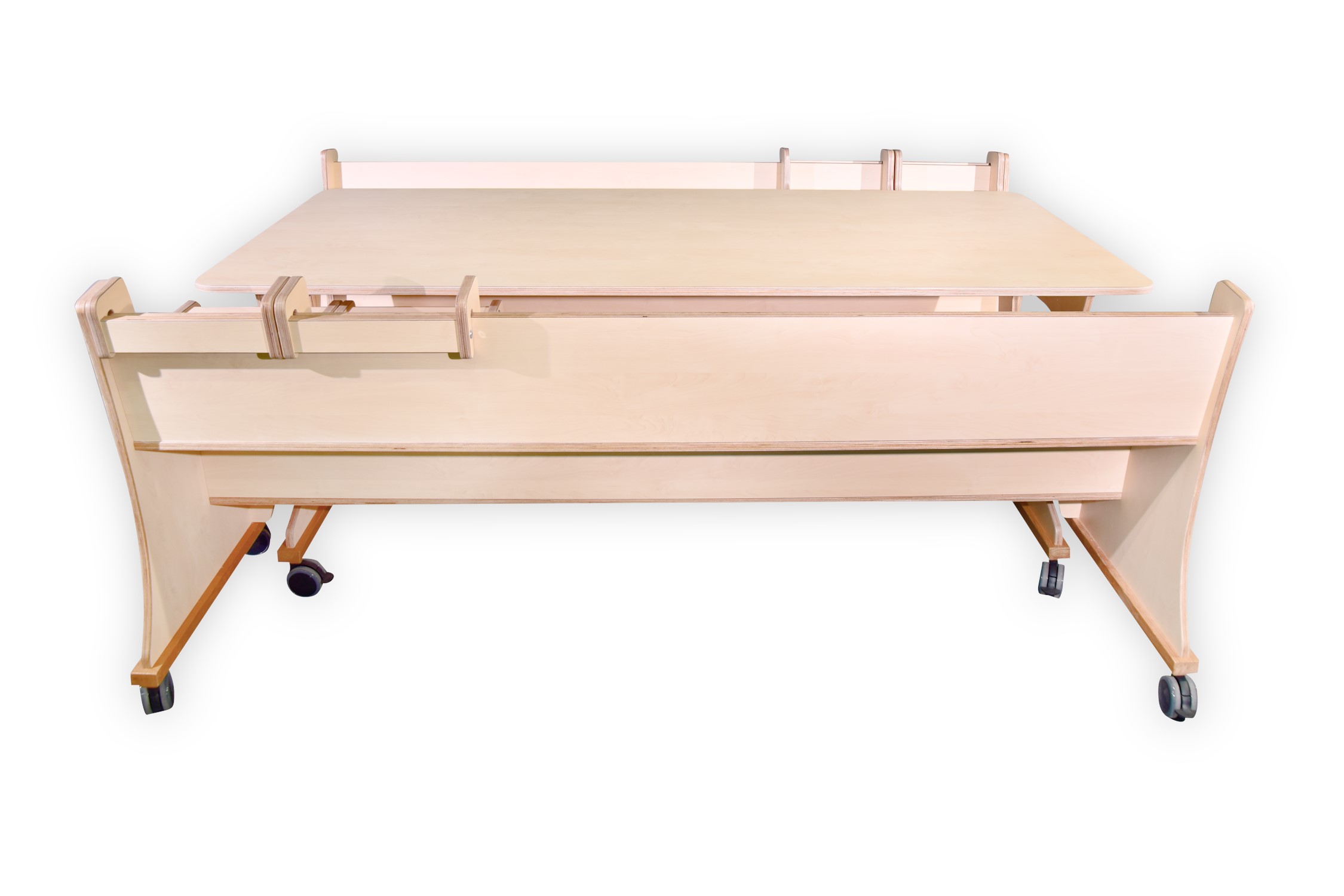 De tafel en banken zijn opgebouwd uit 18mm berken multiplex met witte hpl toplaag,