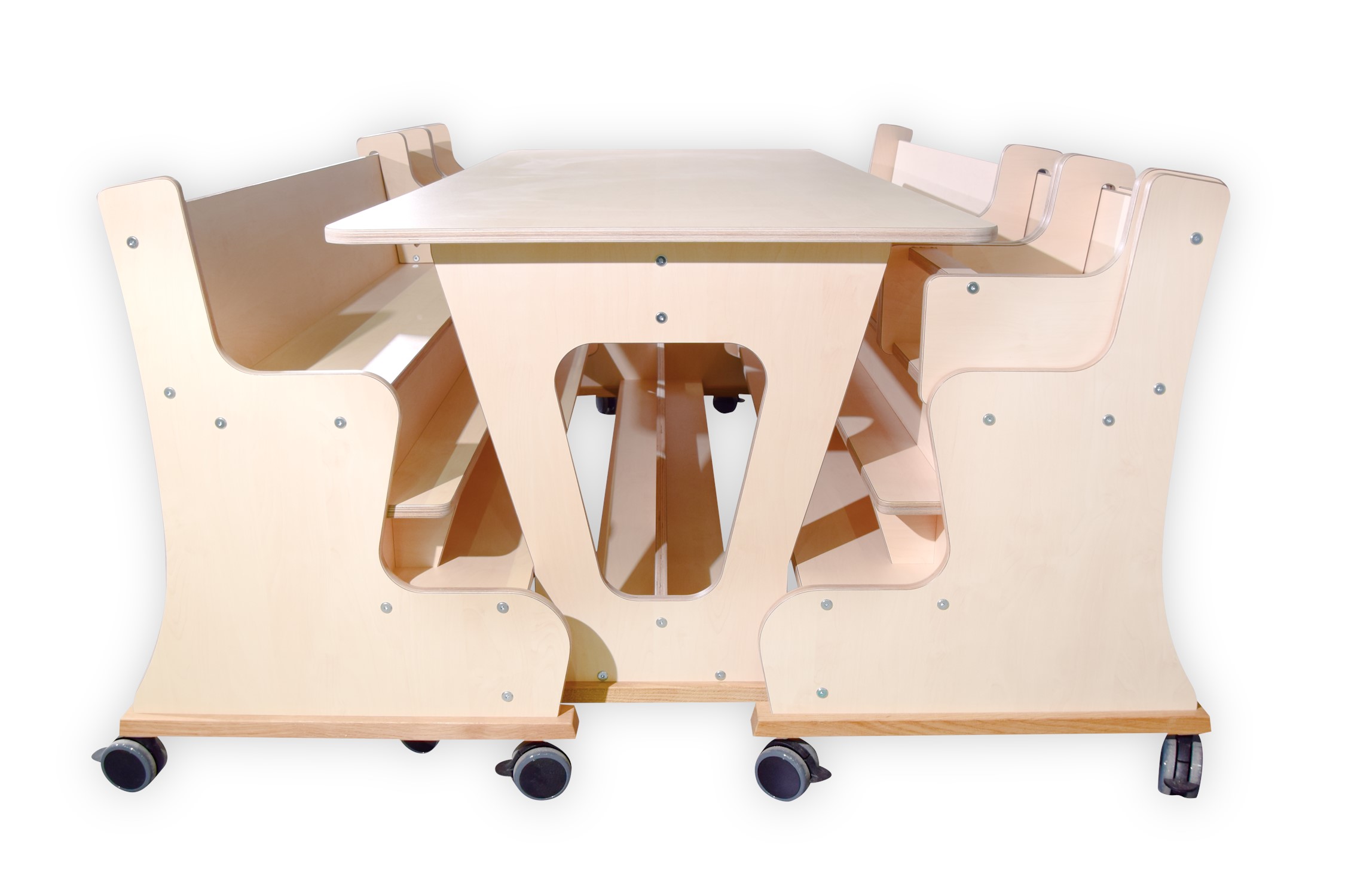 De tafel en banken zijn opgebouwd uit 18mm berken multiplex met witte hpl toplaag,