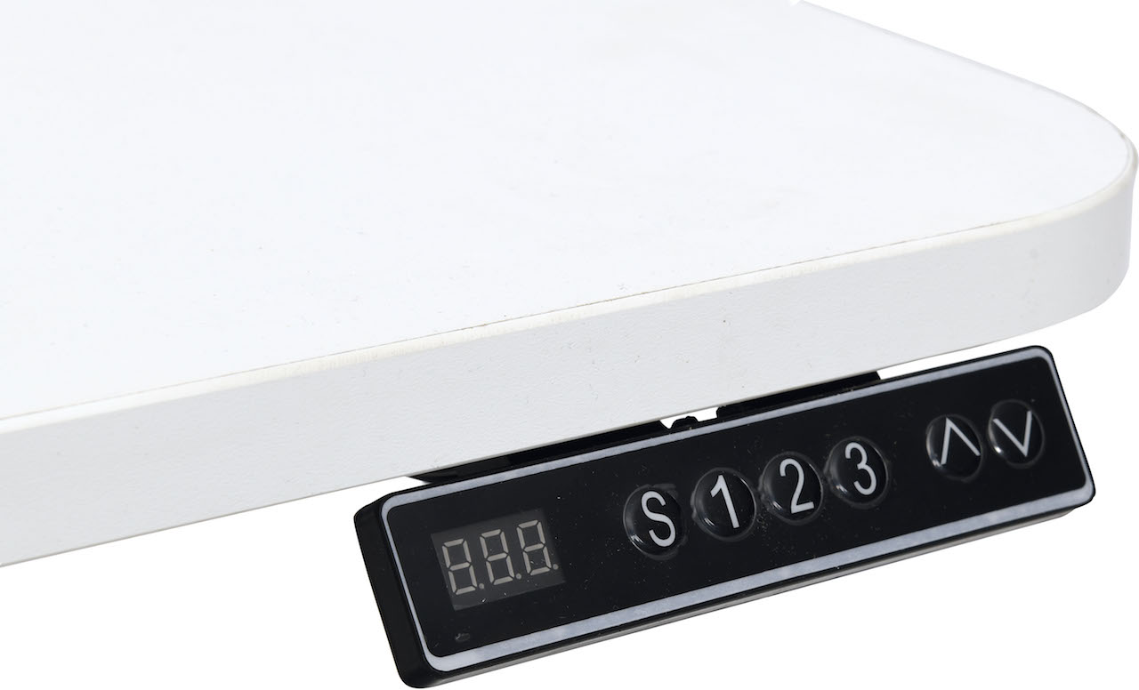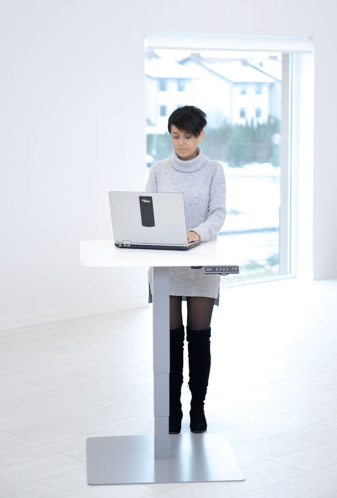 Ronde stabiele tafel met vierkante poten met soepele elektrische hoogteverstelling.