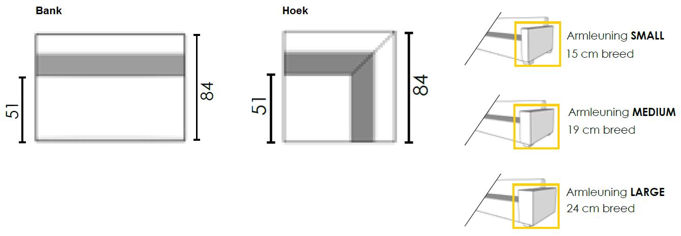 eventueel verbonden met een hoekdeel of gekoppeld aan armleuingen.
