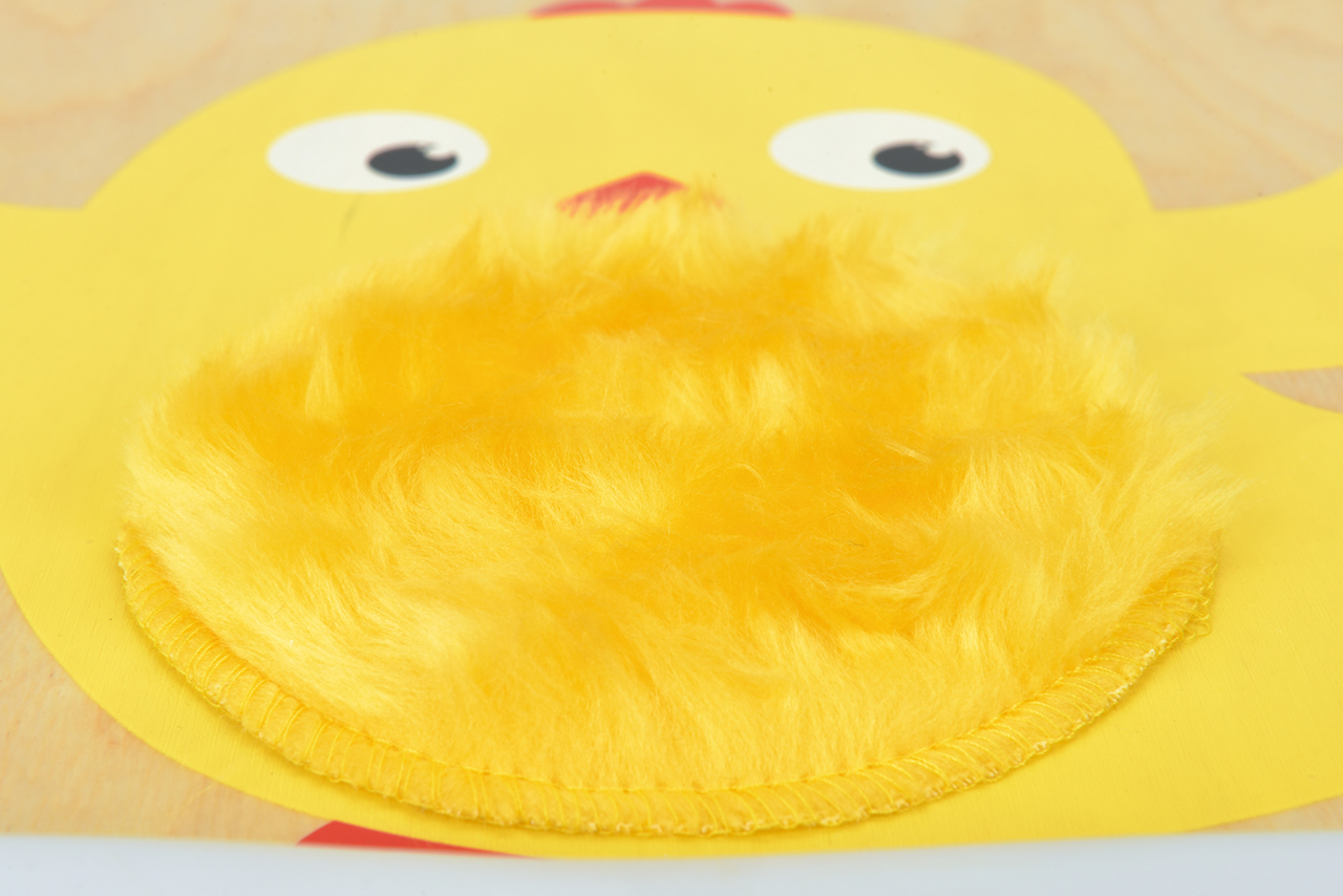 Achter de eischaal schuilt een kuiken met een harige buik en met een piepje erin verstopt.