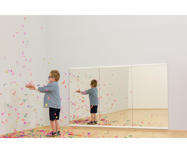 In de extra grote spiegel kunnen de kinderen hun hele lichaam en een groot deel van de omgeving zien.