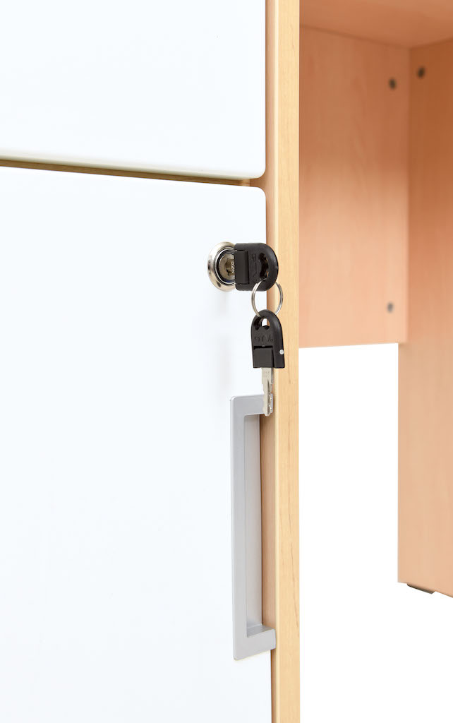 De bureaus worden uitgevoerd met een kastje en lade, beide voorzien van slot,