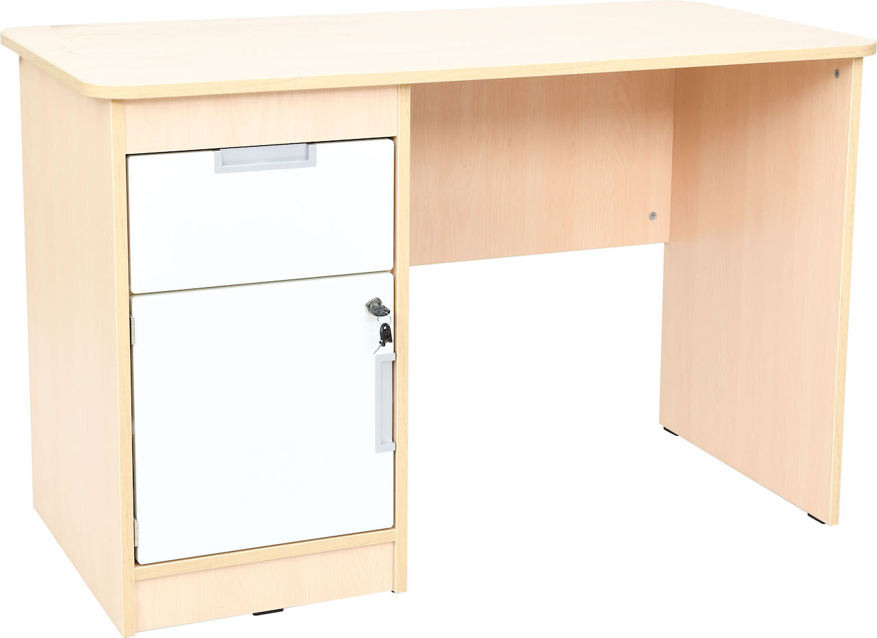 Quadro bureau gemaakt van gemelamineerd spaanplaat, leverbaar in de kleur wit, esdoorn of combinatie van wit met esdoorn. De bureau?s worden uitgevoerd met een kastje en lade, beide voorzien van slot, welke zowel rechts als links onder het bureau geplaatst kunnen worden. Afmeting: 120 x 60 cm