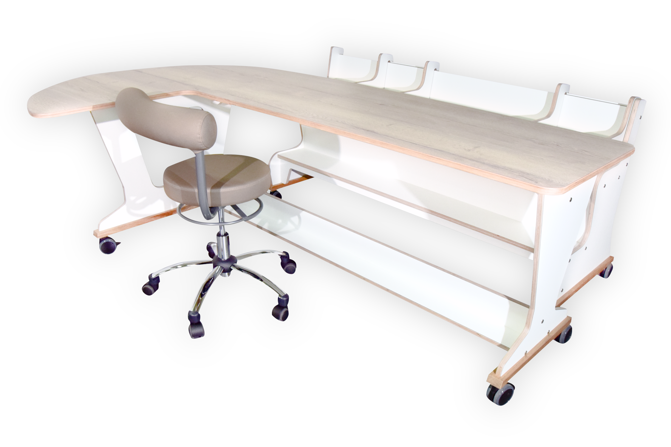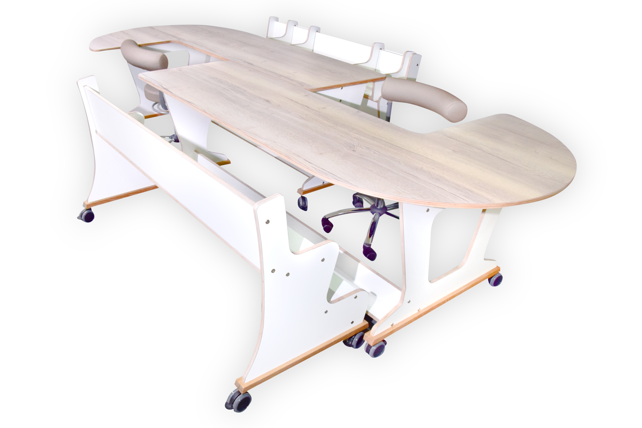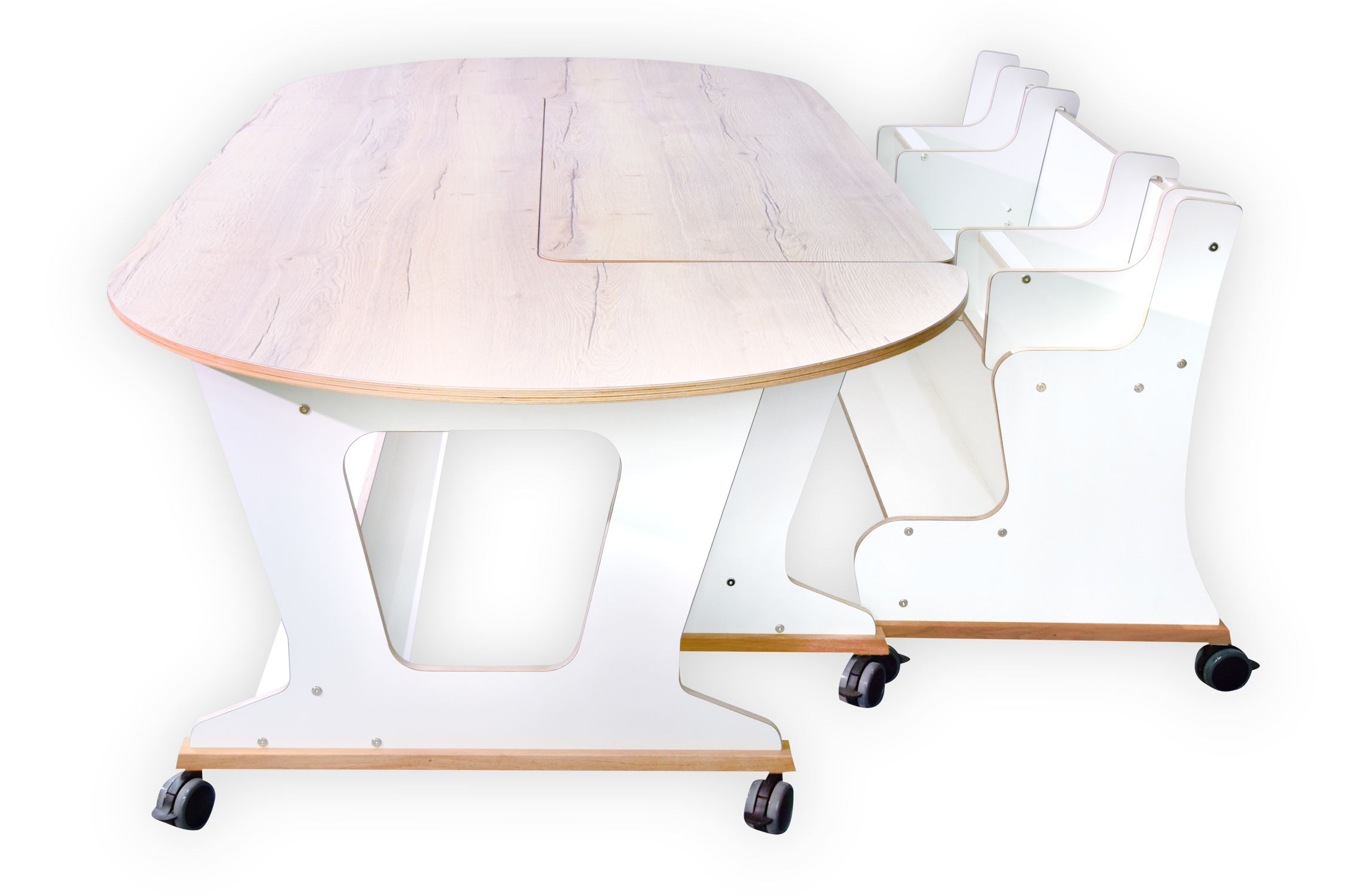 De tafels en banken zijn opgebouwd uit 18mm berken multiplex met witte hpl toplaag,