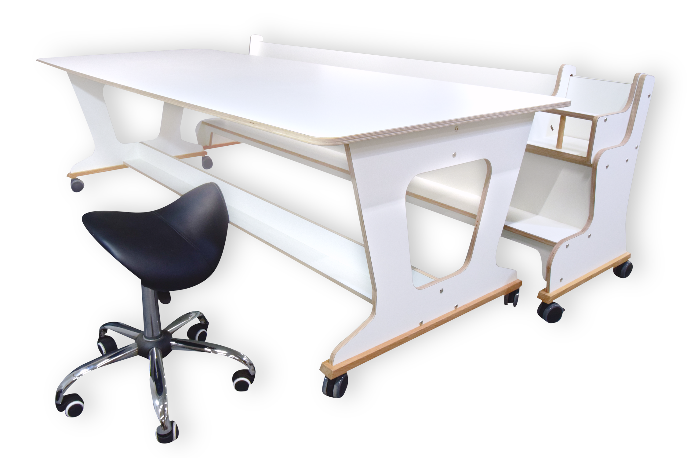 De tafel en bank zijn opgebouwd uit 18mm berken multiplex met witte hpl toplaag,