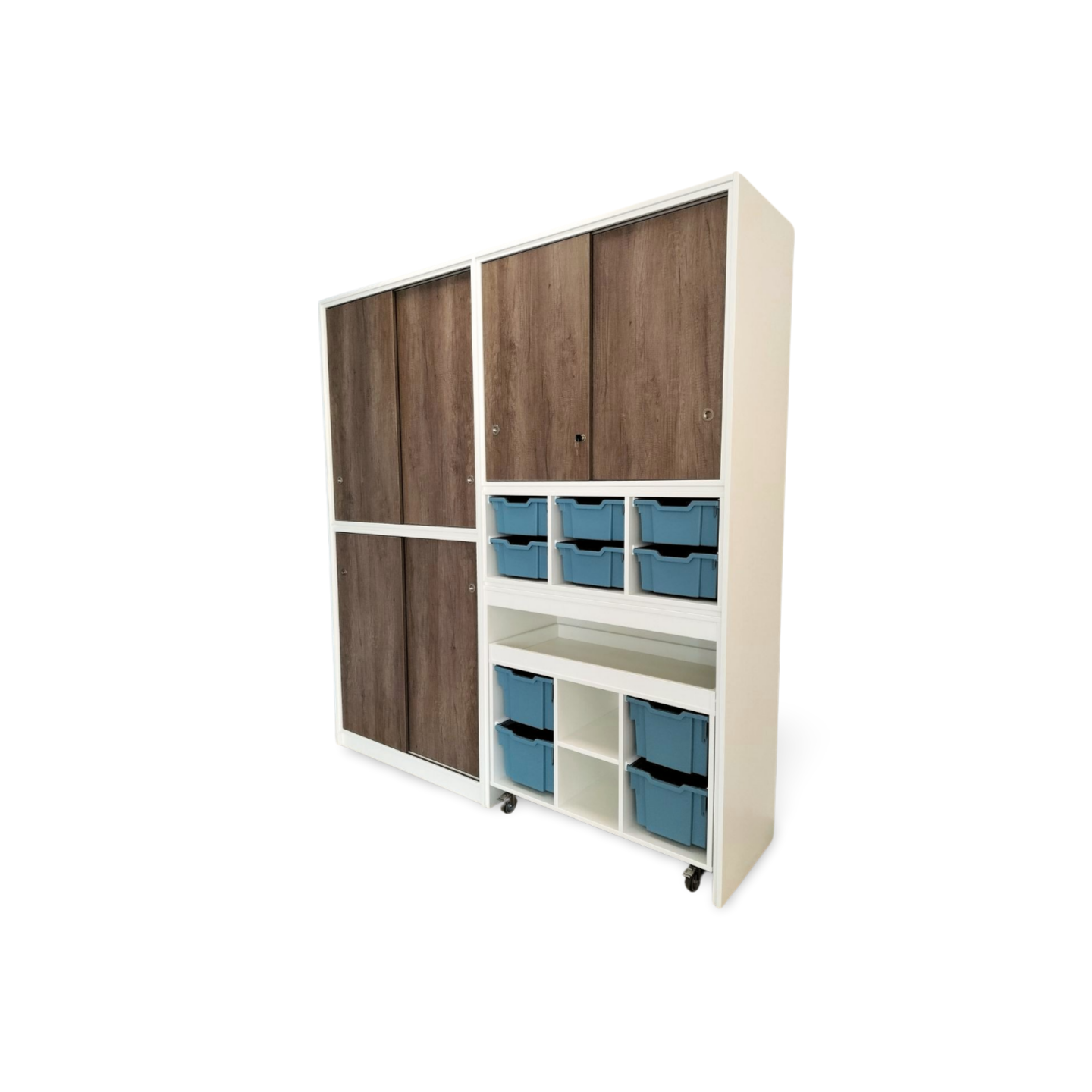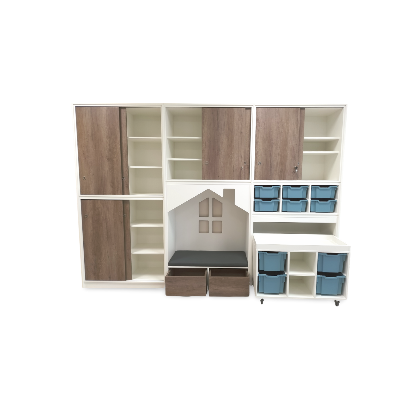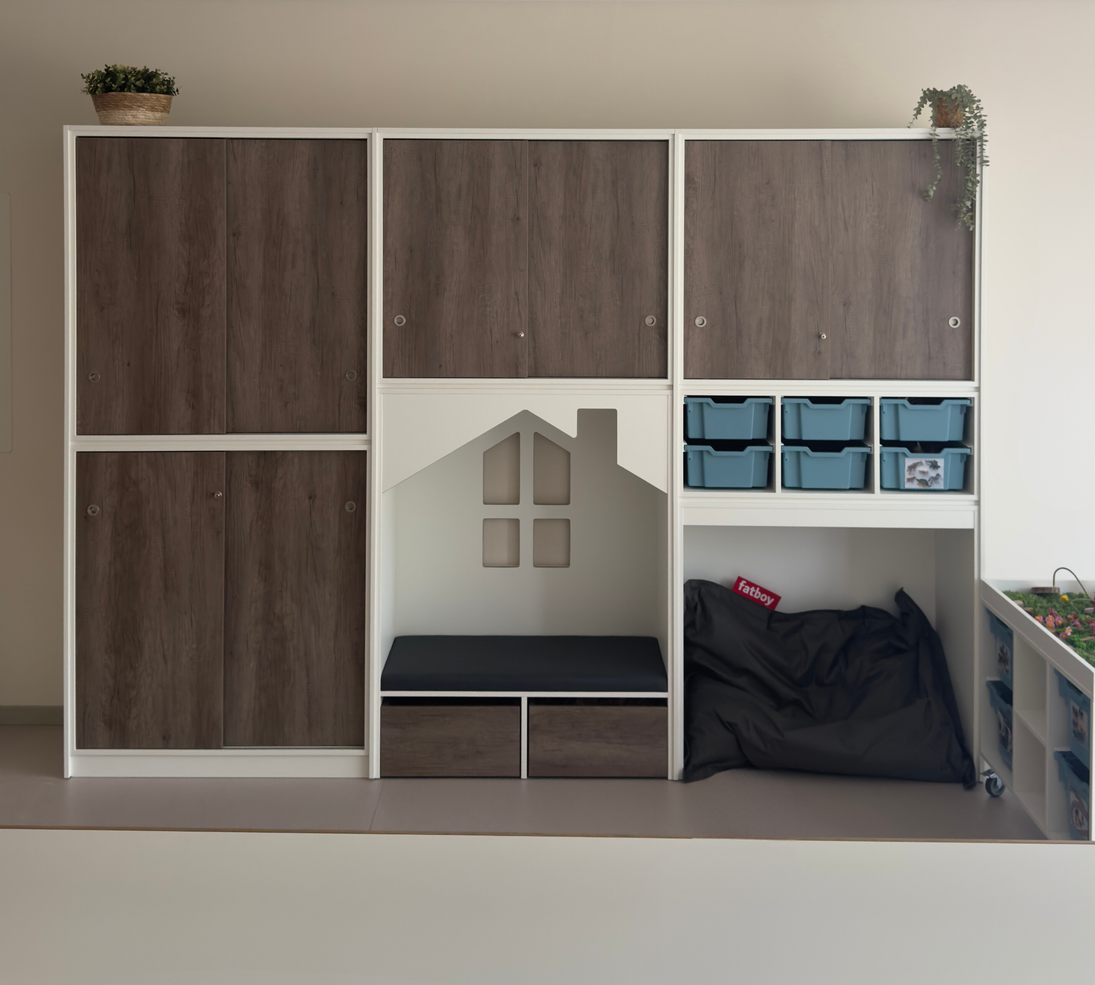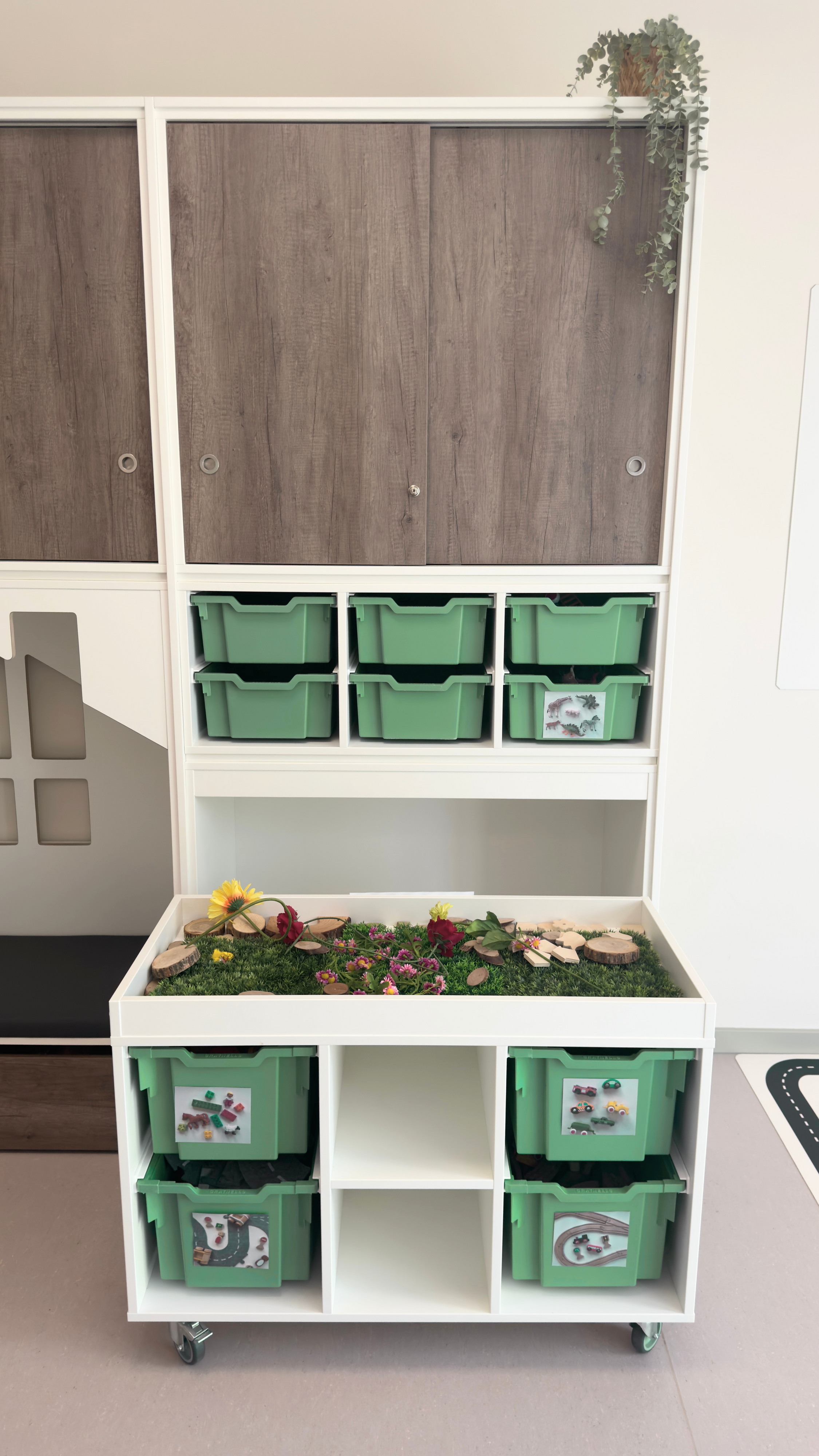 een lage speeltafel inclusief 4 middelhoge Gratnell lades H15 in een kleur naar keuze.