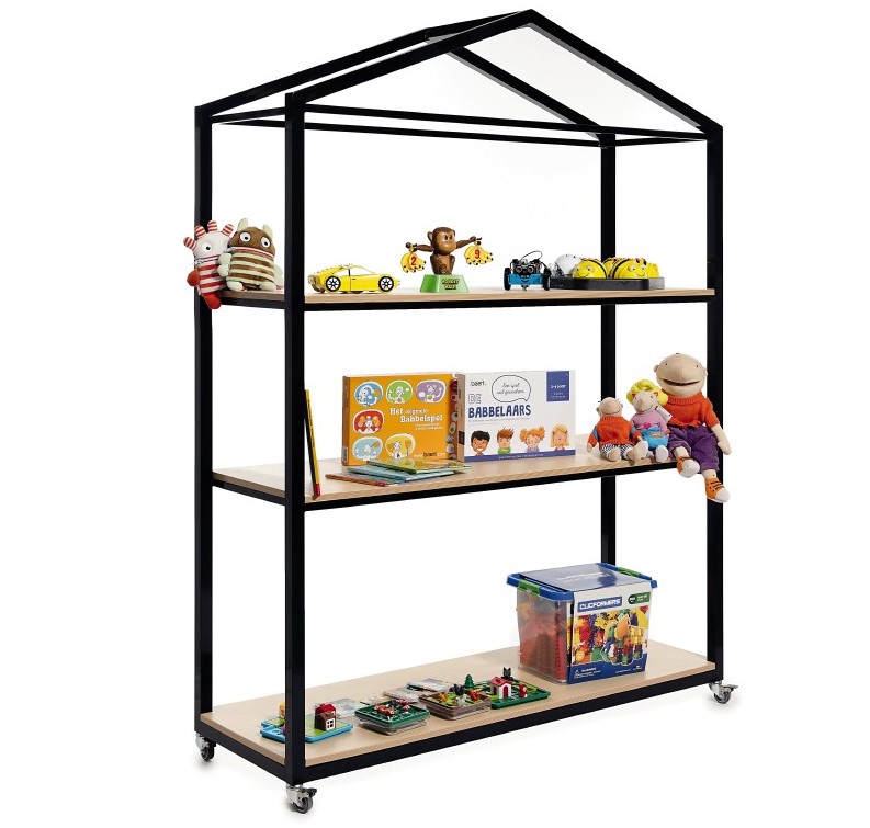 Kast-huisje op wielen met 3 legplanken die ondersteund worden door metalen dragers.