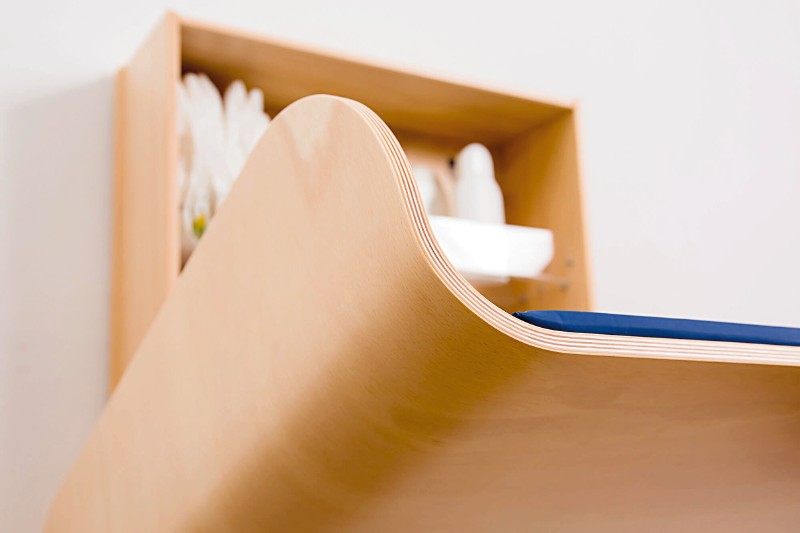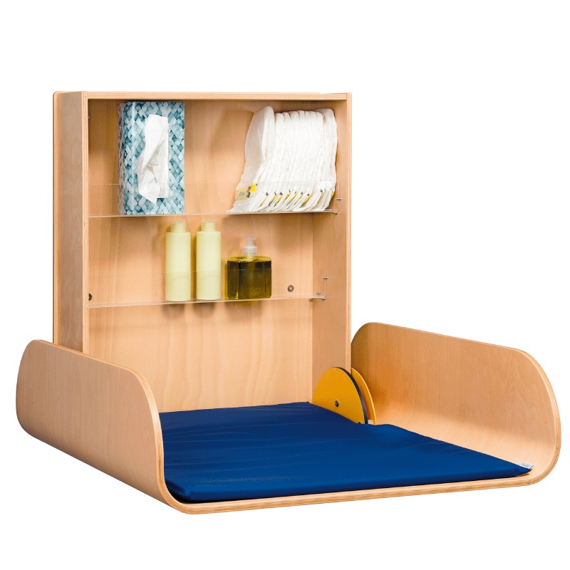 Opklapbare verzorgingstafel die met 1 hand te bedienen is.