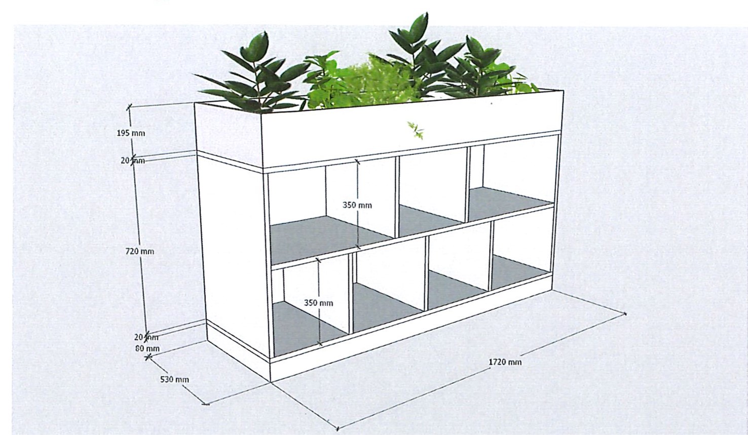 Kieskast met vakken en bovenin een plantenbak.