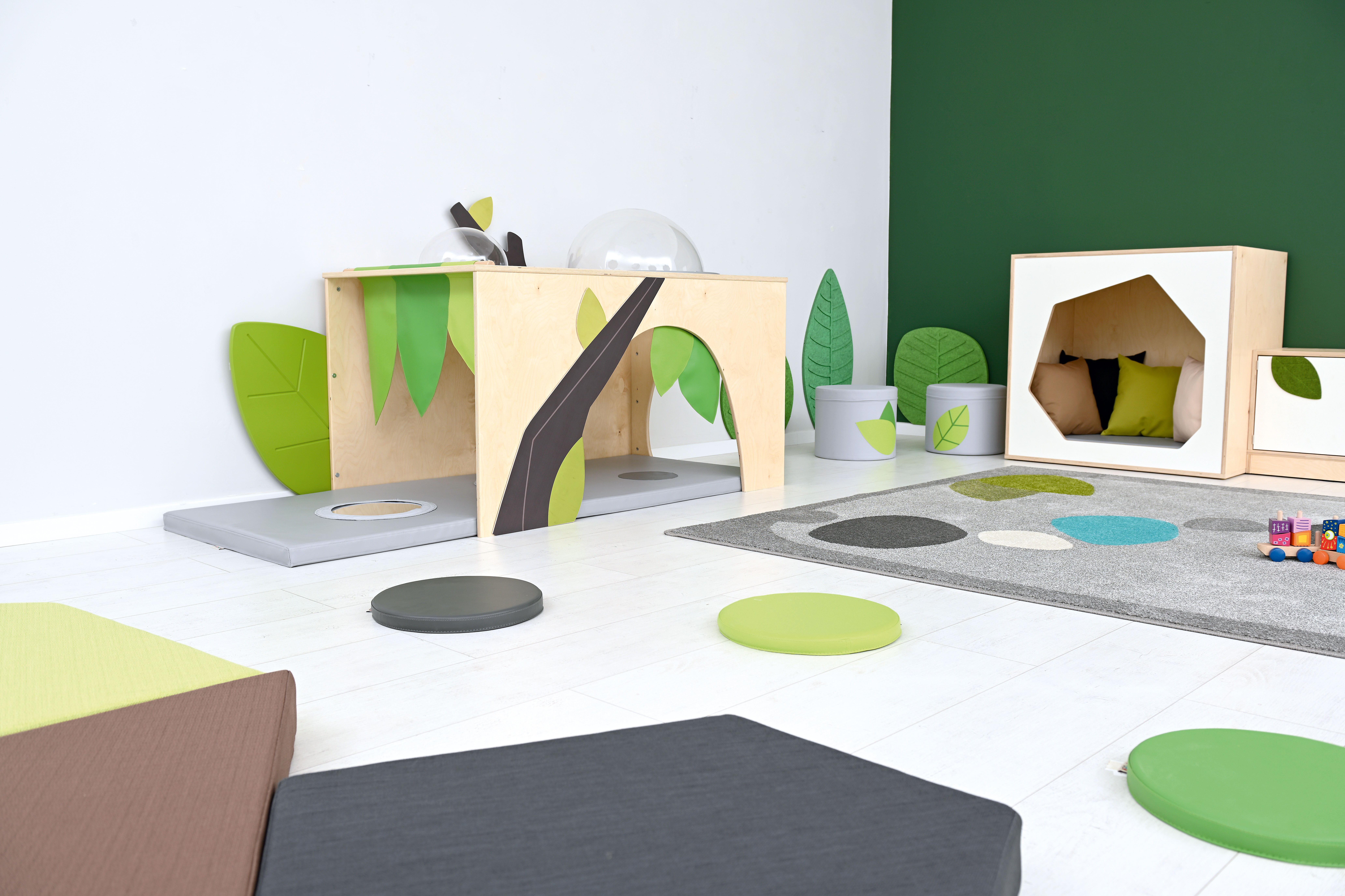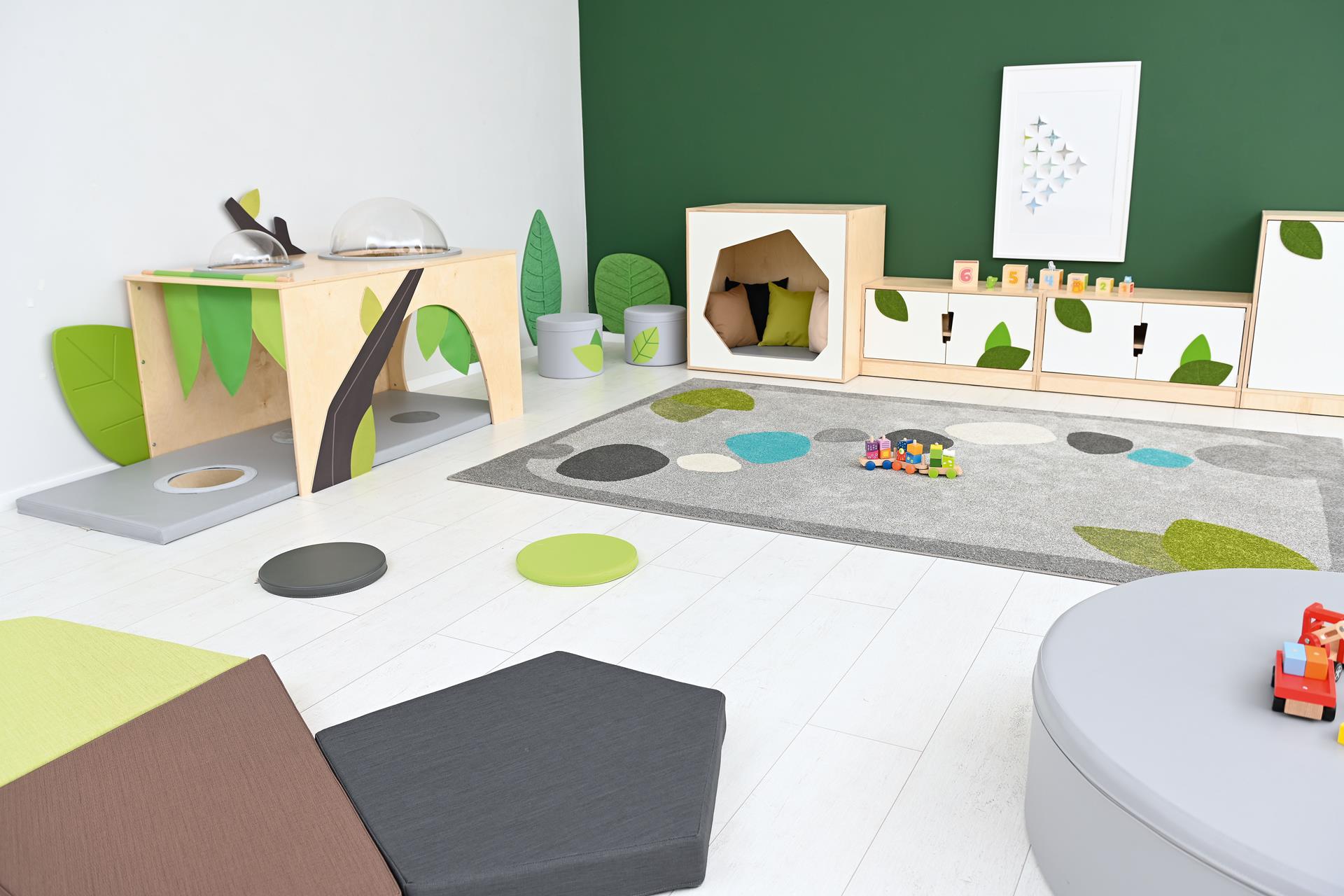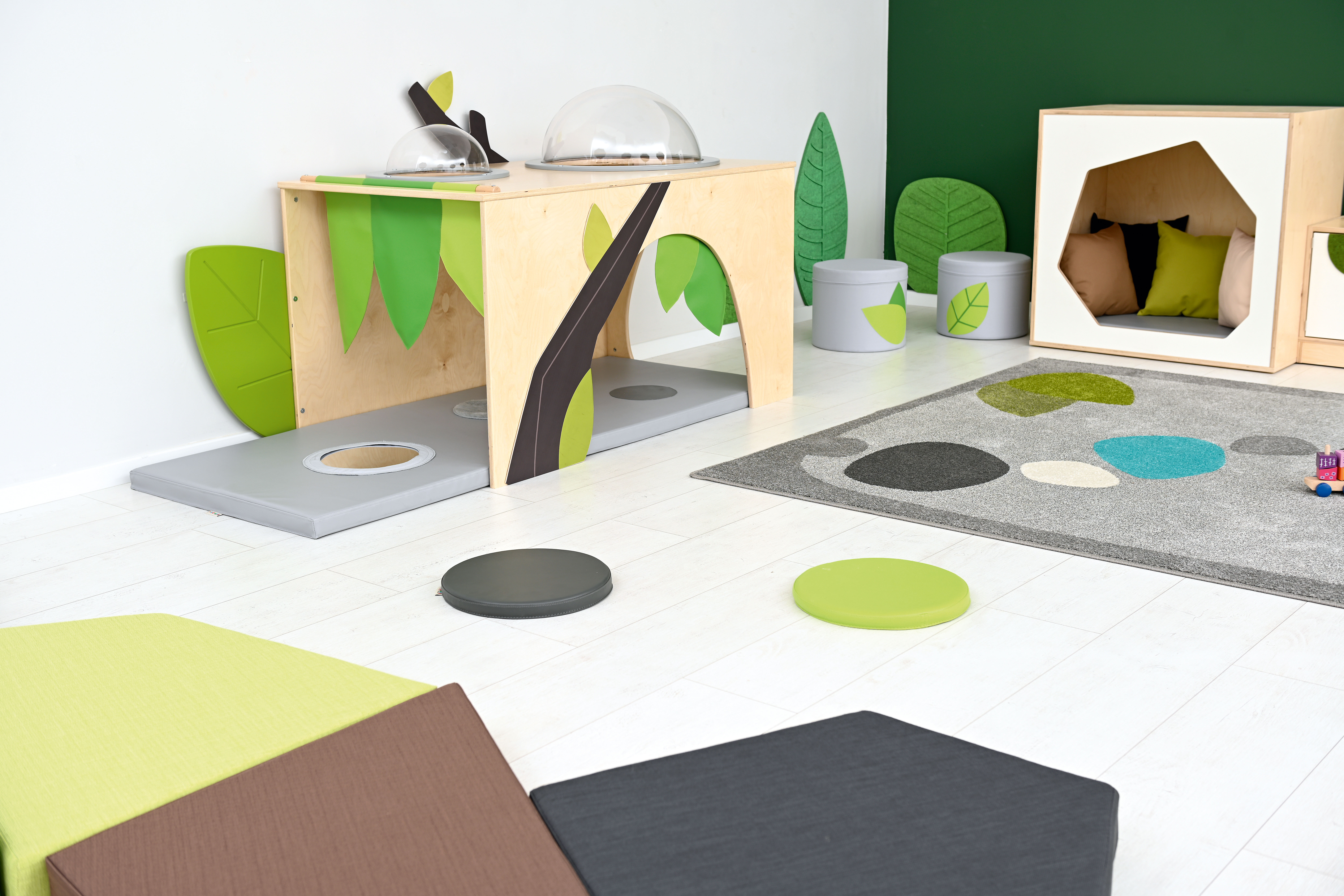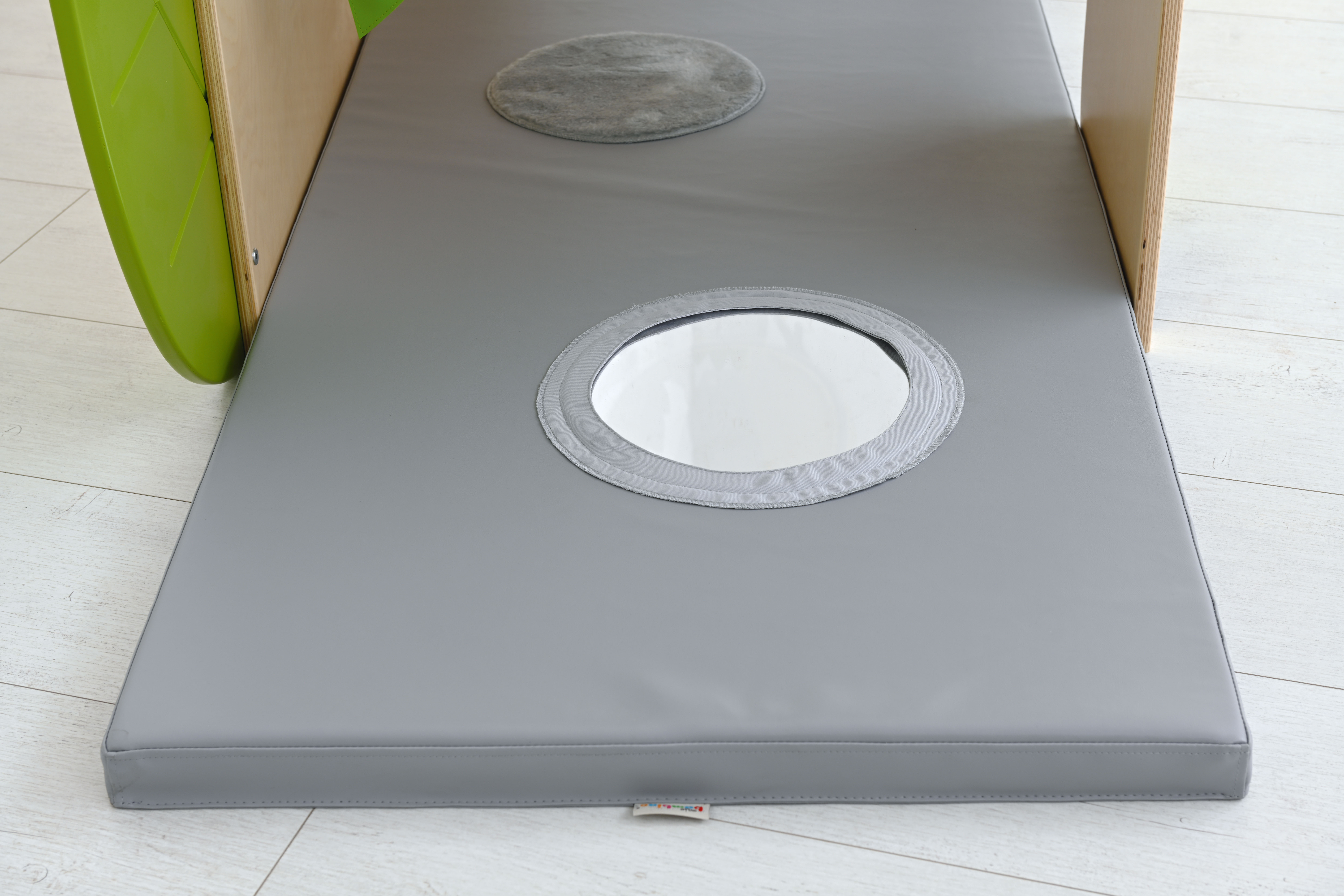 De hoek is voorzien van een zacht matras met sensorische stiksels en een spiegel.