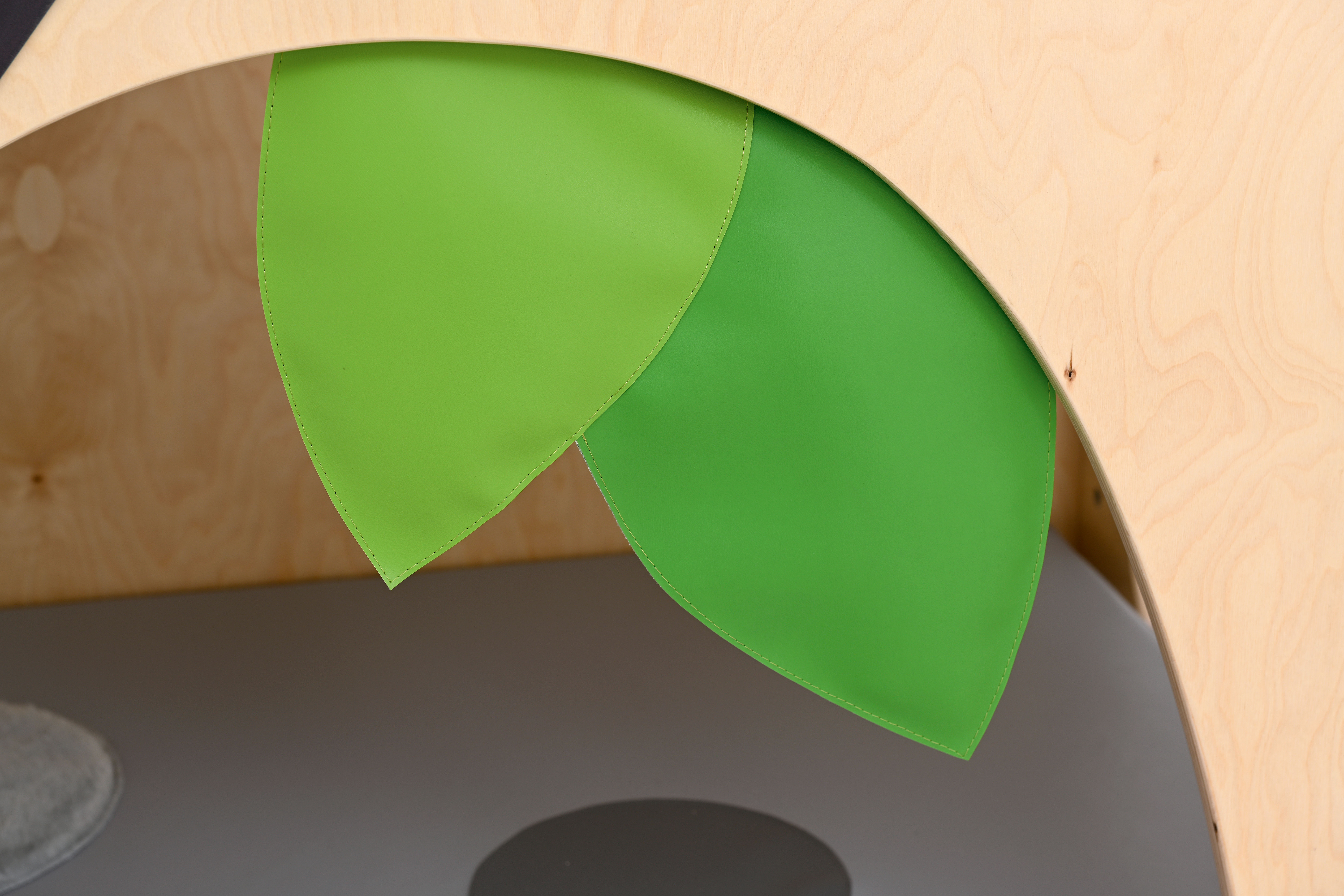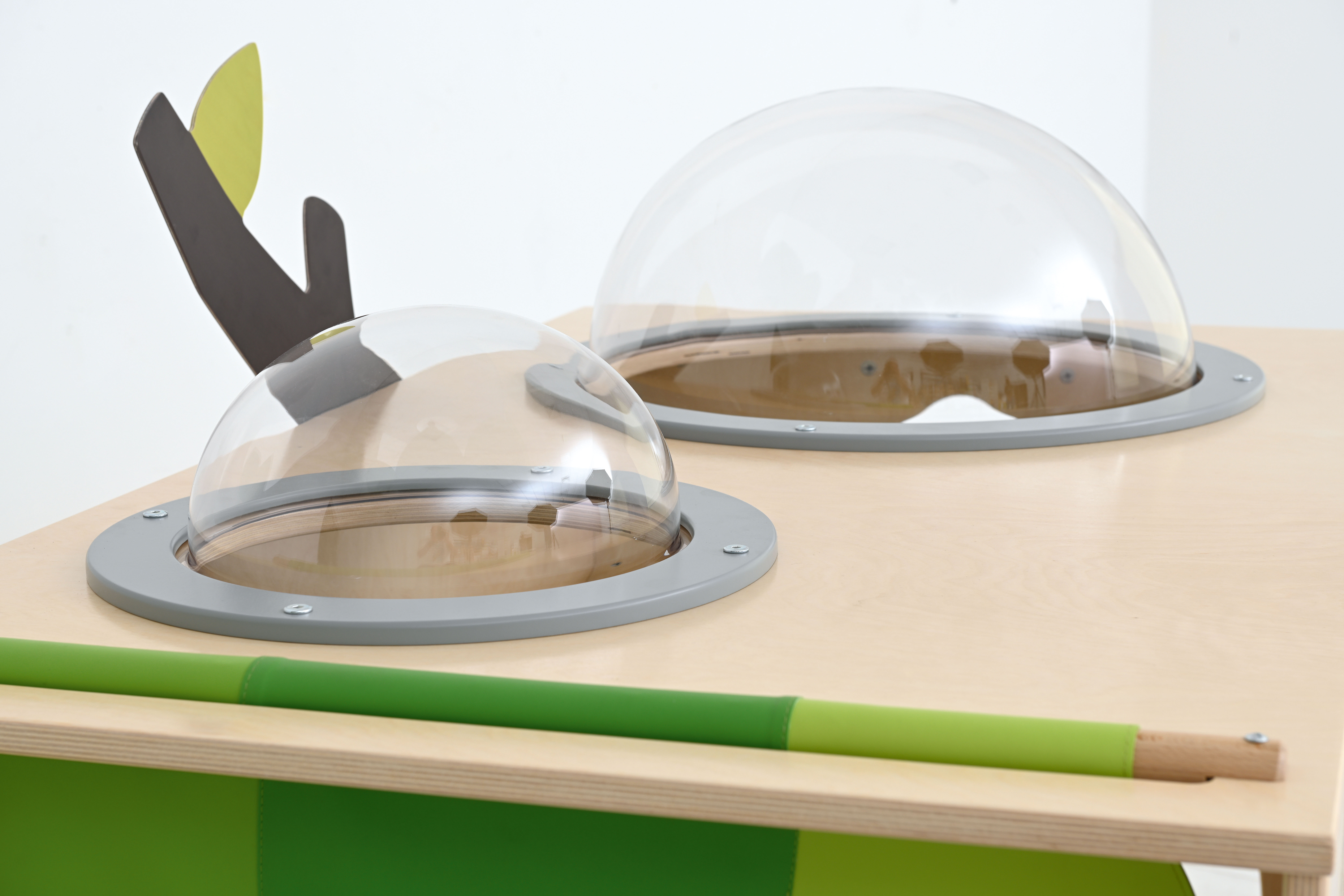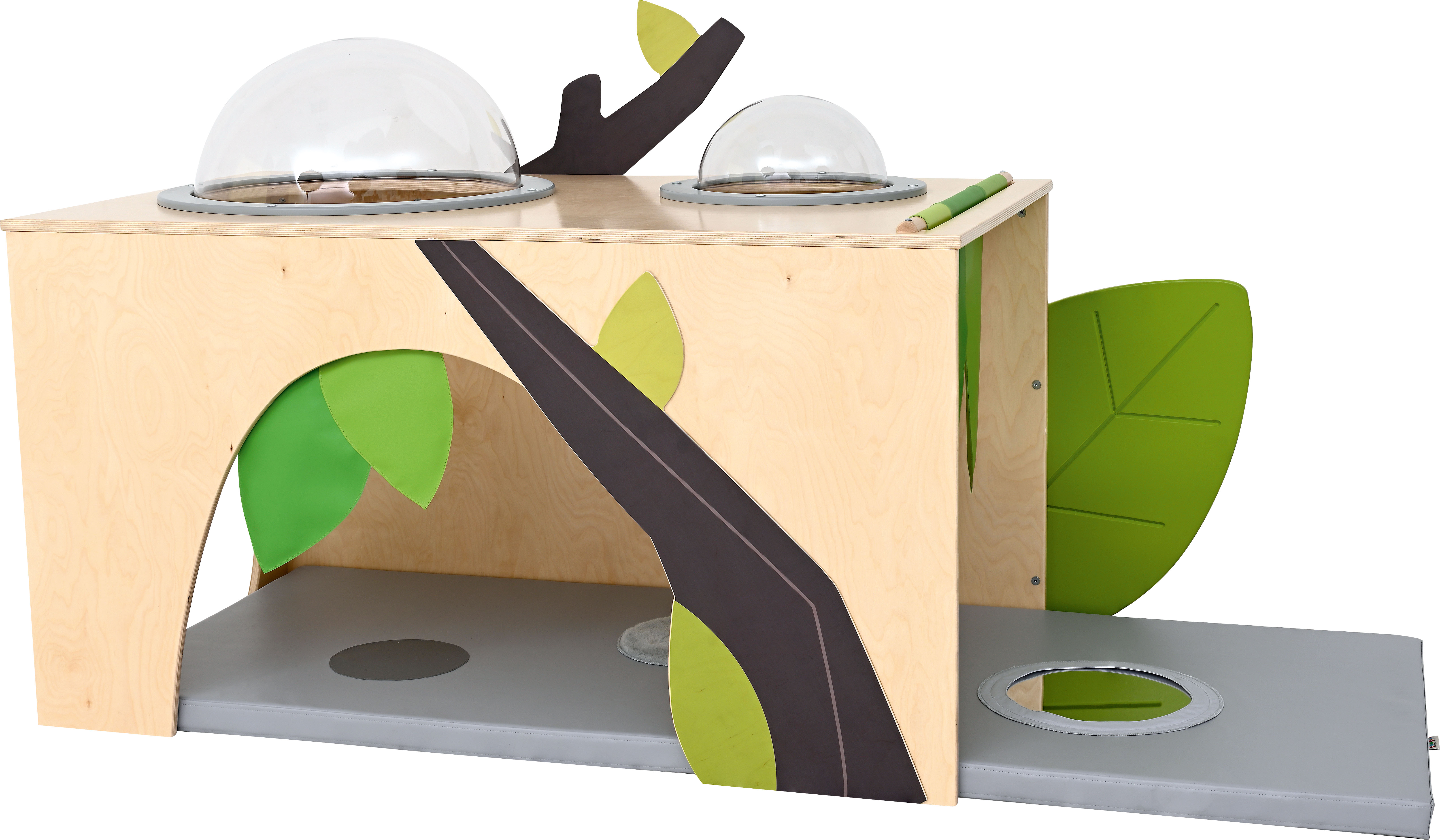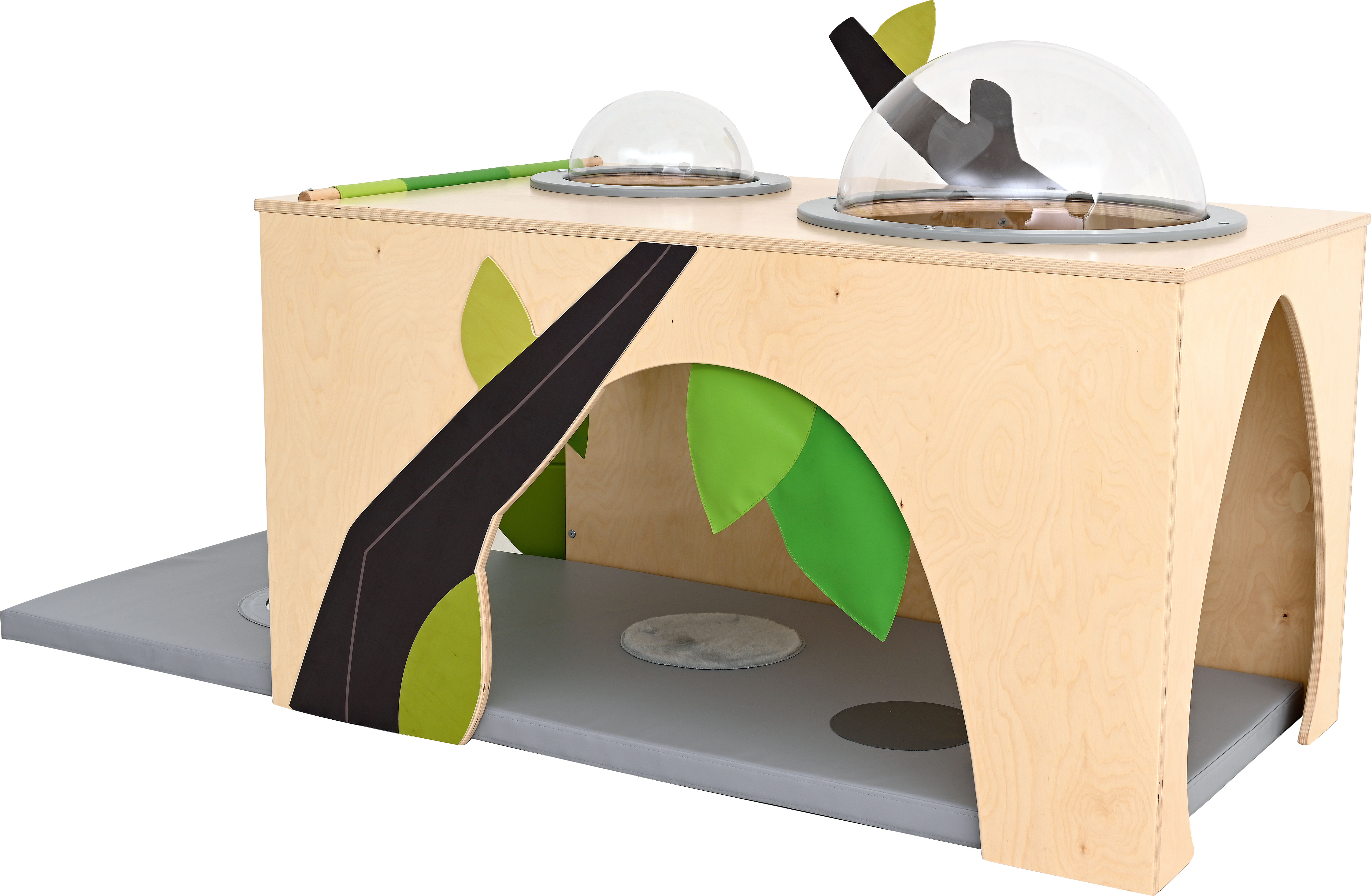 De hoek is voorzien van een zacht matras met sensorische stiksels en een spiegel.