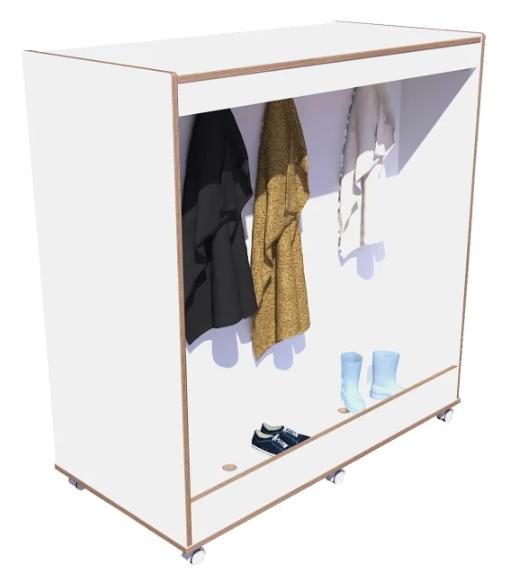 Slimme oplossing bij weinig ruimte: deze verrijdbare kapstok-vakkenkast-combinatie.