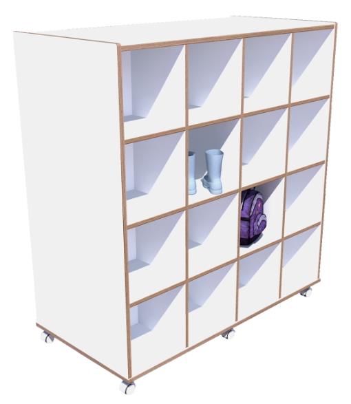 aan de andere kant een vakkenkast met 16 vakken (4x4) voor tassen.