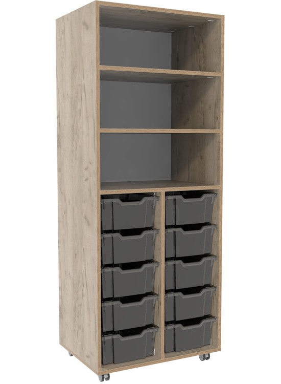 Hoge verrijdbare flex-kast met 3 grote opbergvakken boven en onderin ruimte voor 2 bakmodules onderin.