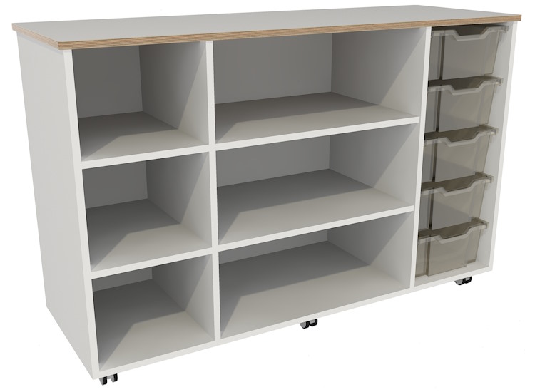 Lage verrijdbare flex-kast met 6 grote opbergvakken en rechts ruimte voor 1 bakmodules.
