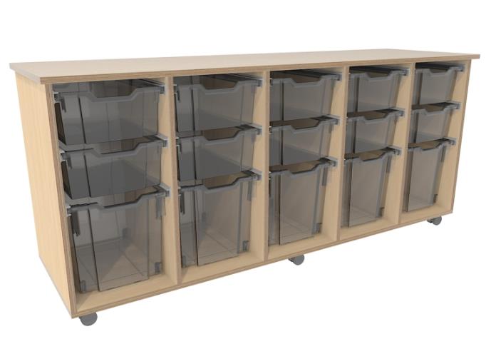 Verrijdbare lage kast met maar liefst 10 medium transparante bakken H15 cm
