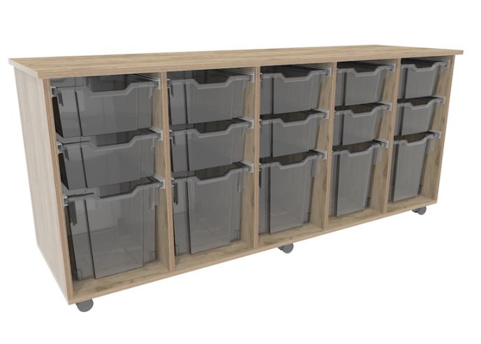 Verrijdbare lage kast met maar liefst 10 medium transparante bakken H15 cm
