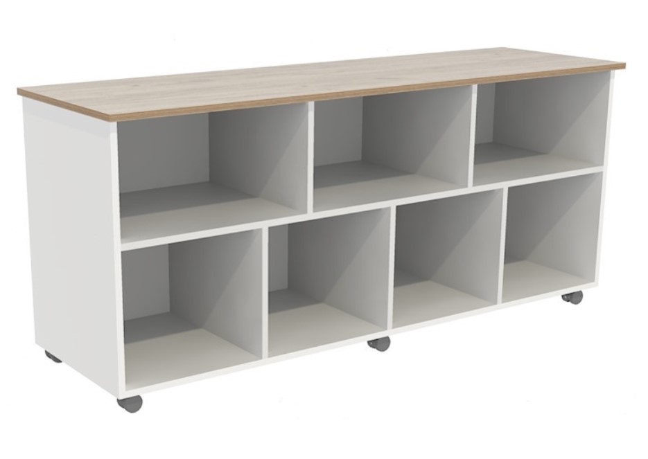 Verrijdbare lage kast met maar speelse vakjes.