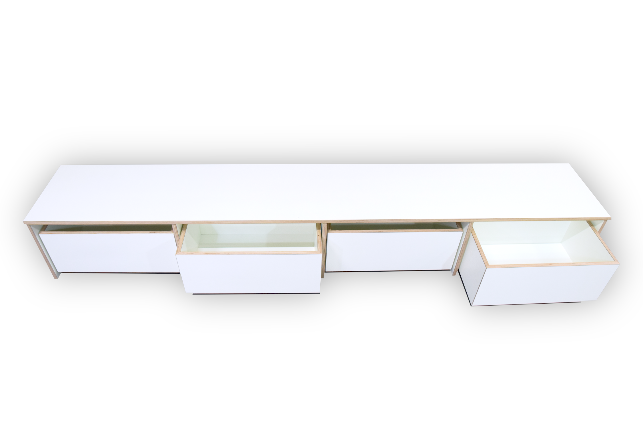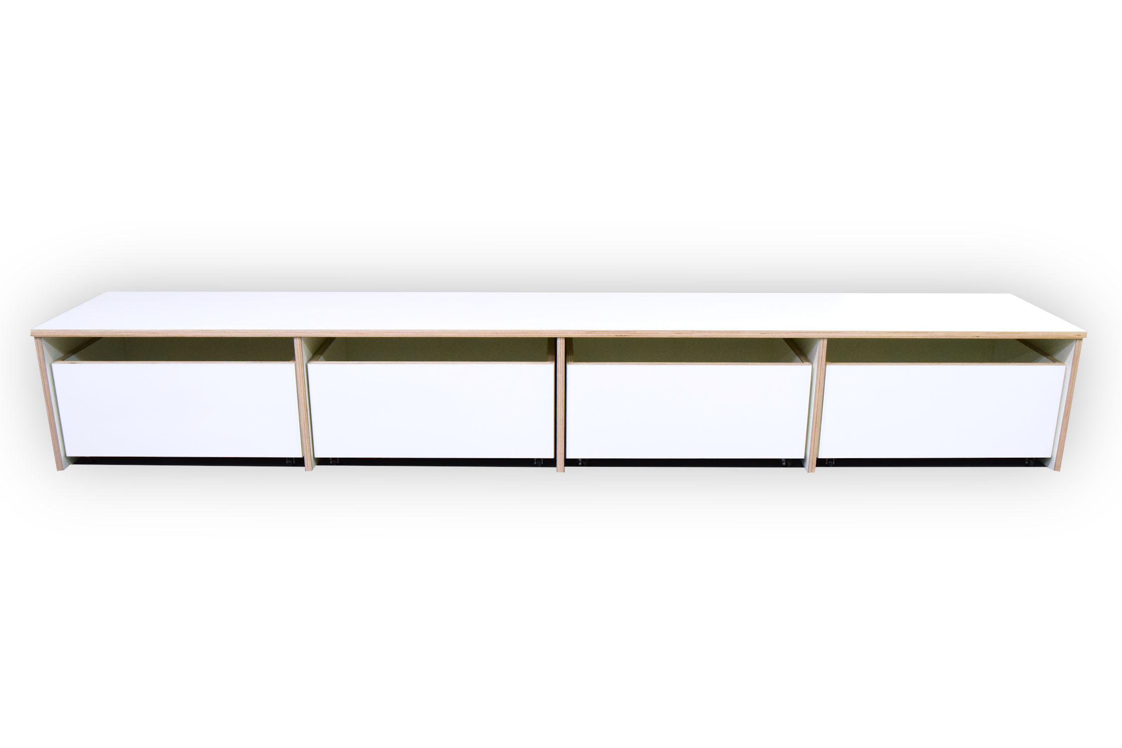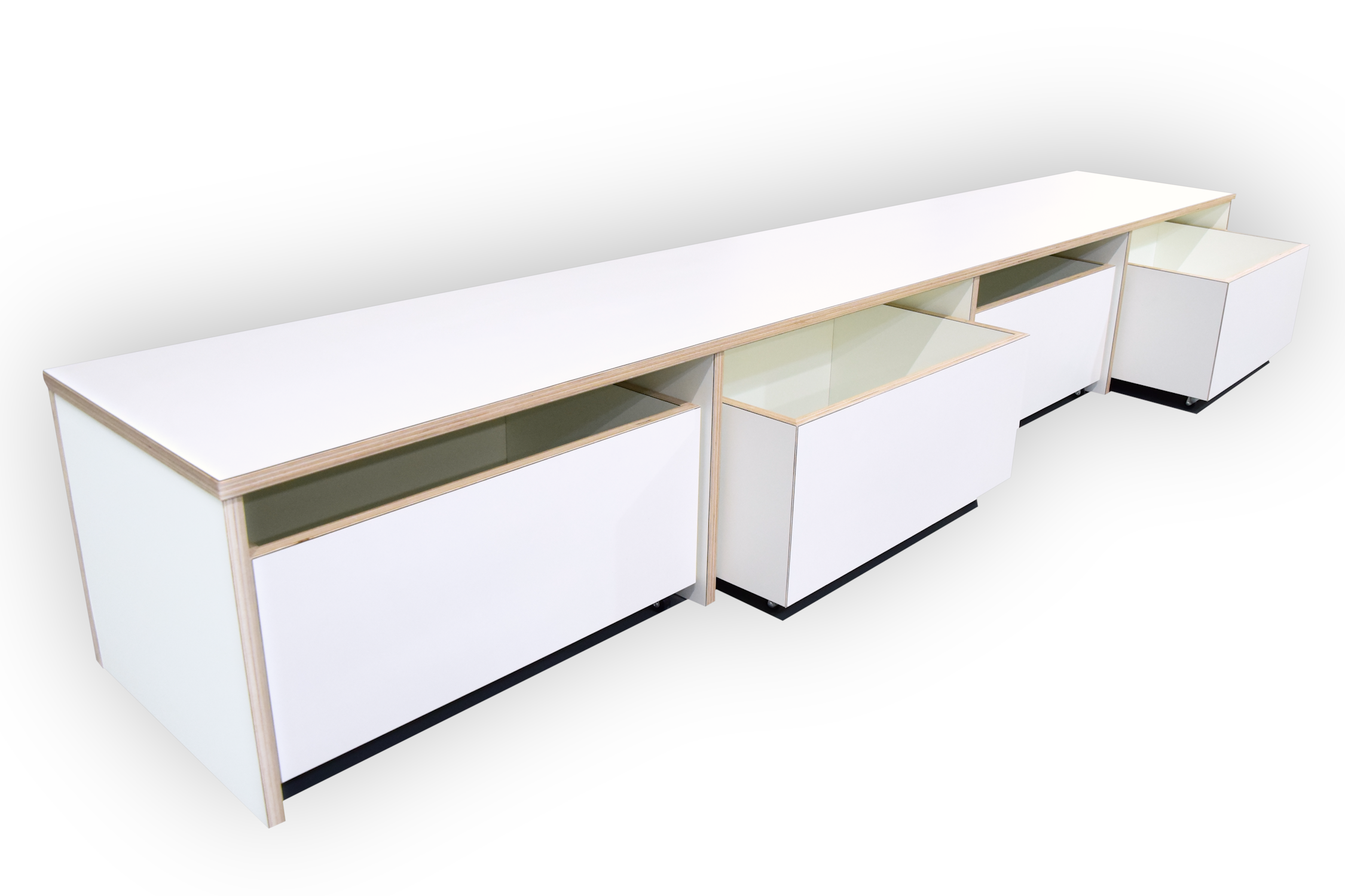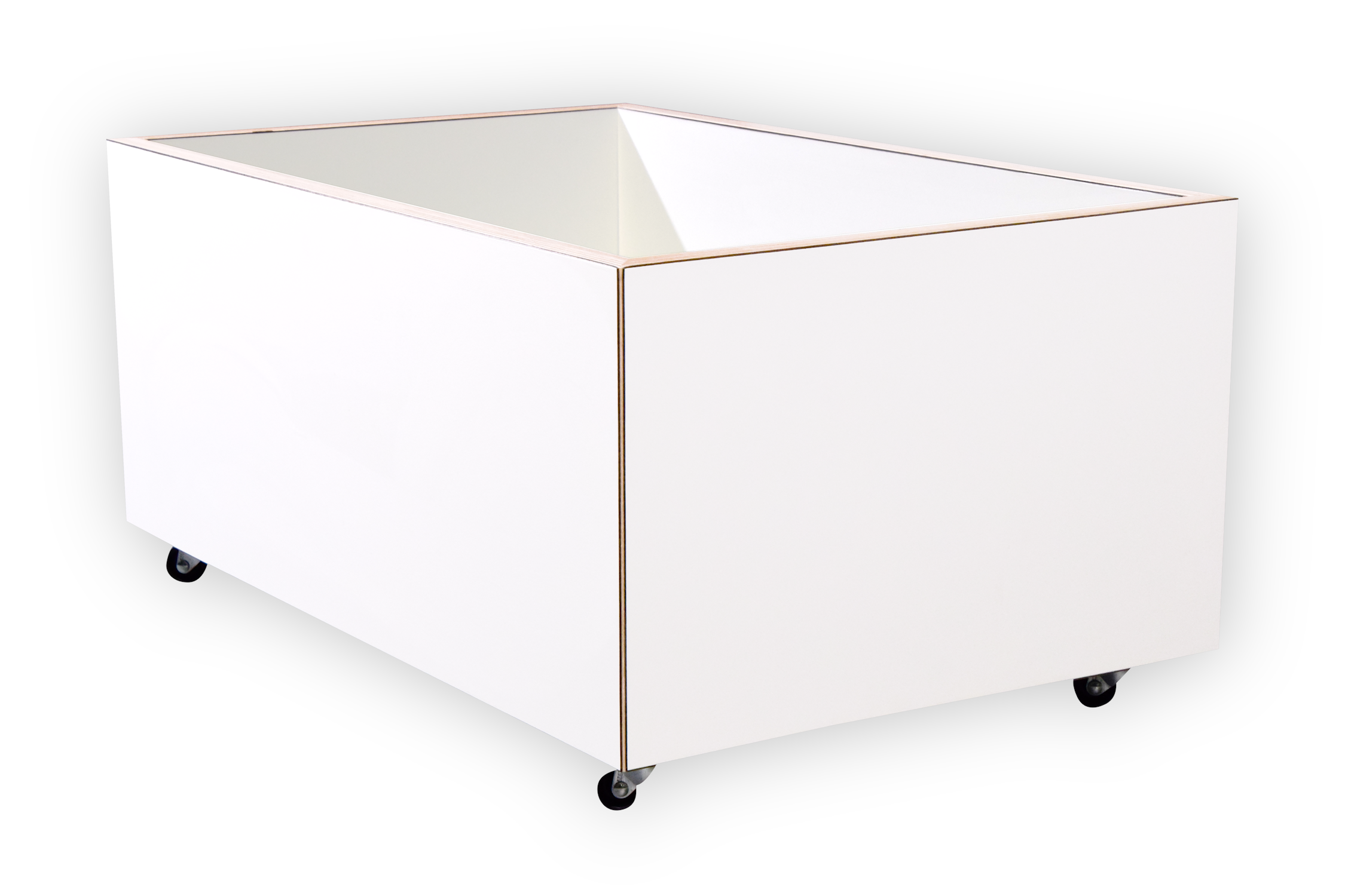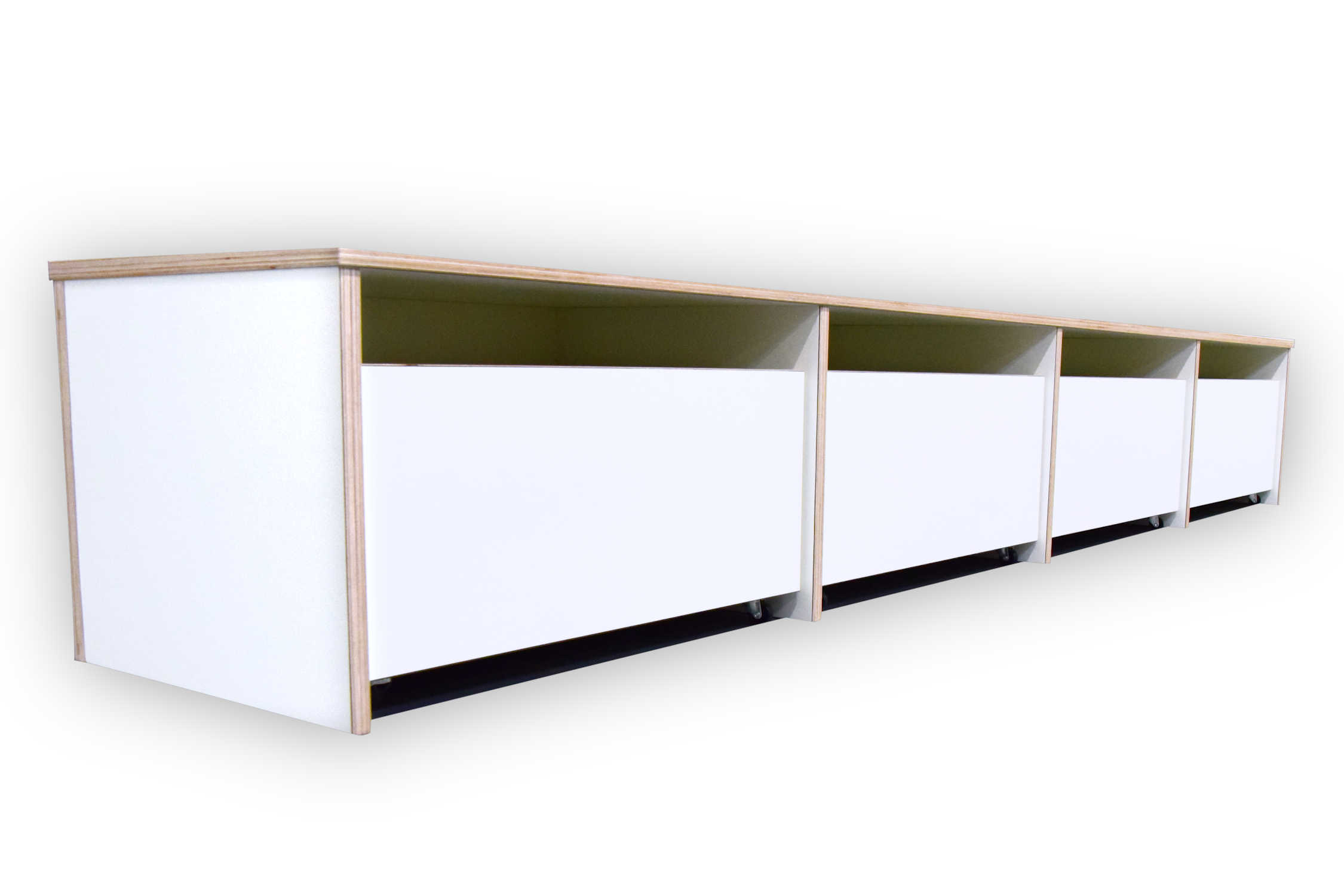 De bank en rolbakken zijn opgebouwd uit 18 mm berken multiplex met witte HPL toplaag.