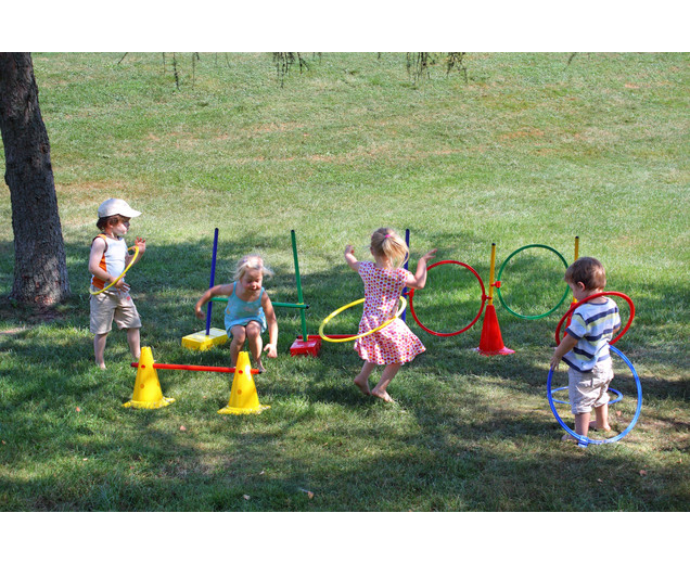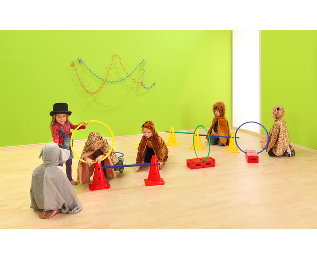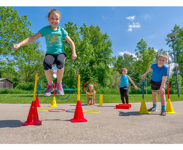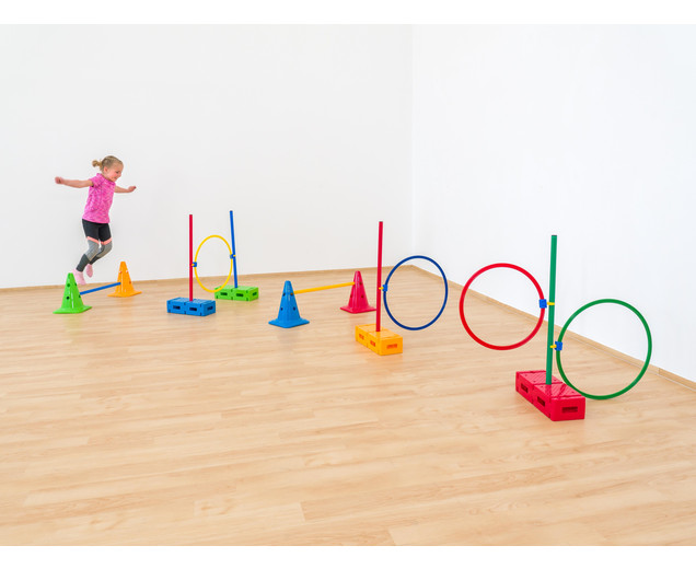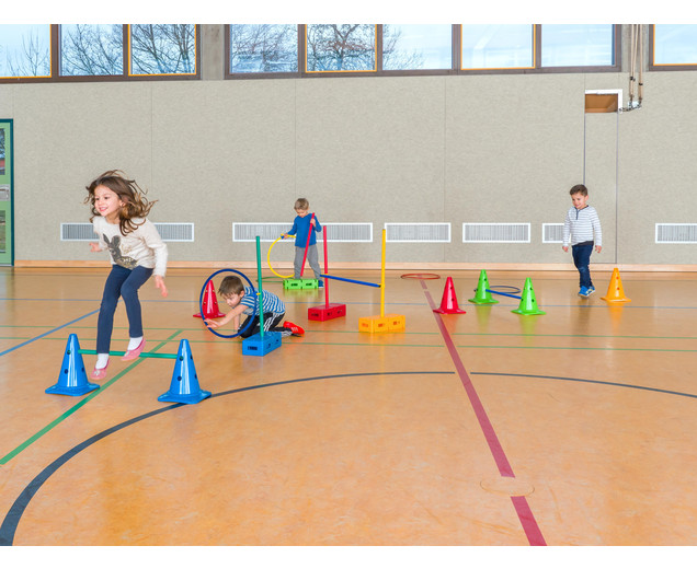 - Wanneer de ritmische balken tussen de kegels worden geplaatst, kunnen de kleintjes eroverheen springen of eronder door kruipen.