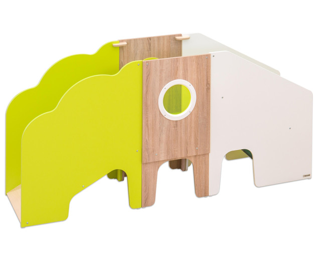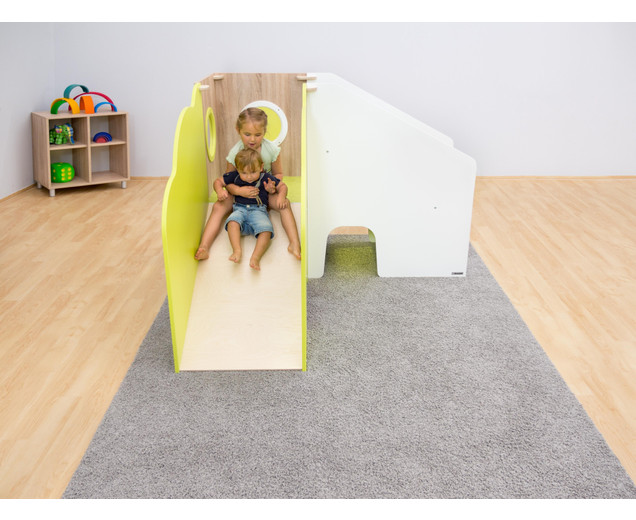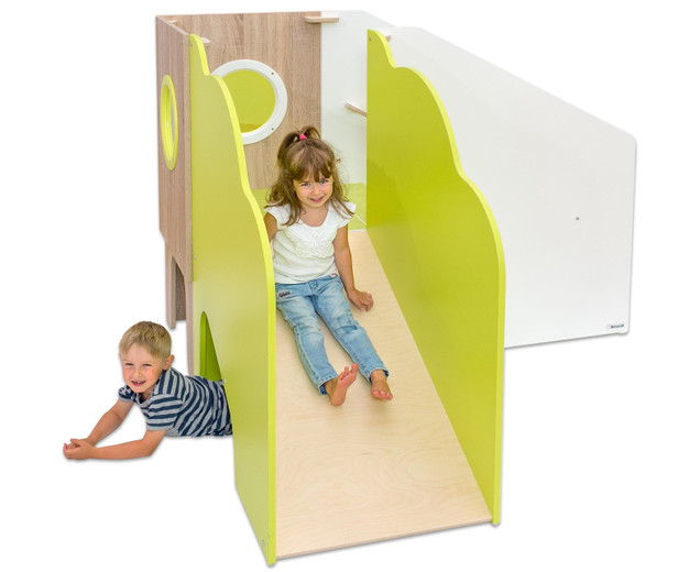 Met de glijbaan, de trap is dit het hoogtepunt voor alle kinderen. Het kan worden gebouwd in kleine ruimtes om ruimte te besparen over de hoek of gewoon rechtdoor met een ander speelvlak erboven. Het biedt dus voldoende ruimte om te verbergen en te spelen. Het groene acrylglas op de trap verlicht op magische wijze de kruipende grotten onder het speelkasteel. De trap met zijn leuning aan beide zijden is al geschikt voor de kleintjes en zacht bekleed met het bewerkte tapijt voor kleine valpartijen.