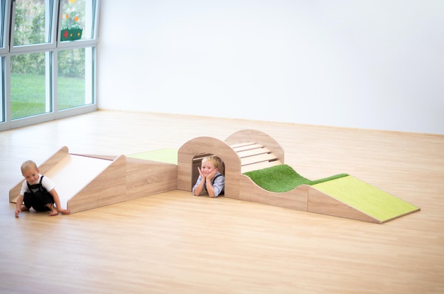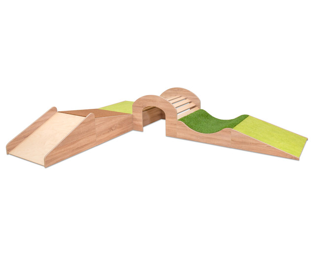 | Het ultieme speelparadijs voor je interieur aangename kleurencombinatie verschillende bedekkingen met educatieve toegevoegde waarde Avonturenlandschap in frisse, vriendelijke kleuren Parcoursset David in het decor eiken en de bekleding in harmonieuze, frisse kleuren, brengt nieuwe wind in uw interieur. De set is ongelooflijk duurzaam en past wonderwel in je dagelijkse leven in de kinderopvang. Dankzij de bevestigde antisliprand zijn alle elementen veilig en kunnen ze niet van hun plaats glijden. De sokkels kunnen zonder schroeven en clips en kunnen daarom flexibel worden herschikt. Elementen ontdekken en ontwikkeling bevorderen Deze set bestaat uit puur avontuur. Een bijzonder hoogtepunt is de tunnel. Hier hebben kinderen een speciale leuke balans en bevorderen ze hun evenwichtsgevoel aan de zijkant. De tunnel is ook ideaal om te kruipen en terug te trekken. Volgens uw behoeften De set David wordt in een kleurencombinatie bij je geleverd - je kunt de podiums zo instellen als je wilt. Natuurlijk kun je op elk moment iets toevoegen aan andere podiumelementen uit ons uitgebreide assortiment. Opmerken: De elementen zijn exclusief ontwikkeld voor gebruik door baby- en kleuterkinderen (0-6 jaar). Daarom is het maximale laadvermogen 120 kg per element. Hoogwaardige materialen - ideaal voor kinderen! De verschillende oppervlakken van de sokkel bevorderen de perceptie en de motoriek van de kinderen en stimuleren de tactiele en visuele zin. Bovendien hebben alle materialen geweldige eigenschappen, waardoor ze bijzonder aantrekkelijk zijn voor gebruik in kinderopvang. Deze set heeft verschillende hoogwaardige rubbers: TRETFORD-tapijt bestaat voor 80% uit geitenhaar en voor 20% uit scheerwol. De natuurlijke materialen maken het bijzonder klimaatregulerend en gezondheidsbeschermend. Bovendien is het antistatisch, stofbindend en duurzaam, evenals vlamvertragend. Linoleum is gemaakt van hernieuwbare grondstoffen. Hij is ook antistatisch en bovendien erg stil. Het oppervlak is antibacterieel en kan perfect worden gereinigd. Het kunstgrasoppervlak geeft de set een authentieke uitstraling met zijn echte uiterlijk. Dit zorgt voor een natuurlijke spelervaring. levering 1x sokkel - oprit, eiken decor, 0-24 cm, linoleumkalk, (hxbxd) 0 / 24x75x75 cm 1x sokkel - goot decor eiken, 24 cm, gras, (hxbxd) 24x75x75 cm 1x sokkel - tunnel, eiken decor, (hxbxd) 56x75x75 cm 1x sokkel - vierkant, eiken decor, 24 cm, linoleum, (hxbxd) 24x75x75 cm 1x sokkel - overgangshelling, eiken decor, 24-36 cm, bruin tapijt, (hxbxd) 24 / 36x75x75 cm 1x sokkel, eiken decor, (hxbxd) 44x75x75 cm Gegevens en feiten te gebruiken: Aanbevolen leeftijd: 3-6 jaar textuur: Materiaal: Hout Afmetingen / gewicht: Gewicht incl. Verpakking: 94 kg. |
