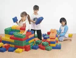 Omschrijving: Een uitgebreide set met 30grote en 15 halve in elkaar passende plastic blokken.