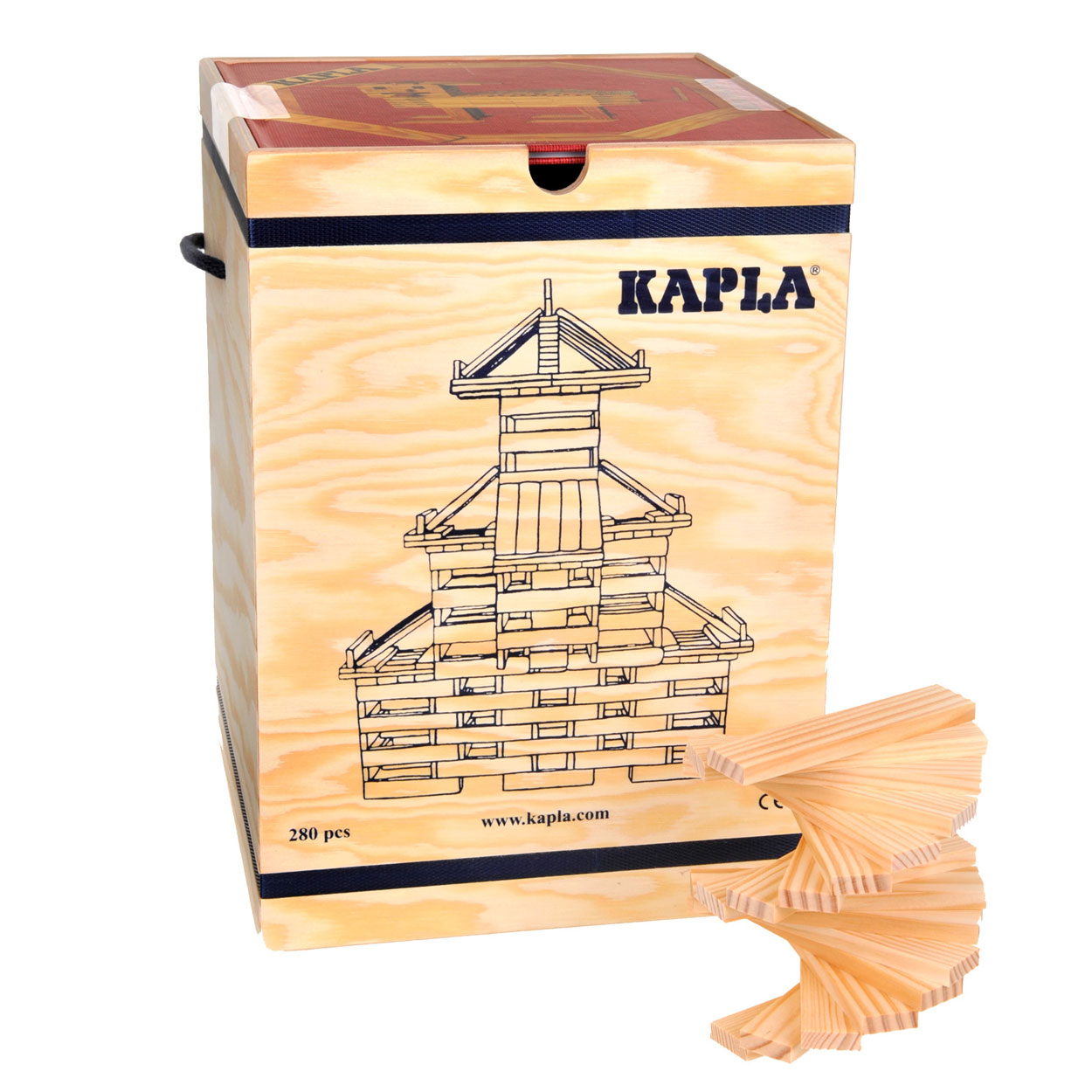 KAPLA Blank doos met 280 grenenhouten plankjes van exact dezelfde ideale maatverhoudingen. De stevige doos is gemaakt van mooi afgewerkt hout met als deksel het KAPLA Voorbeeldboek Deel 1.