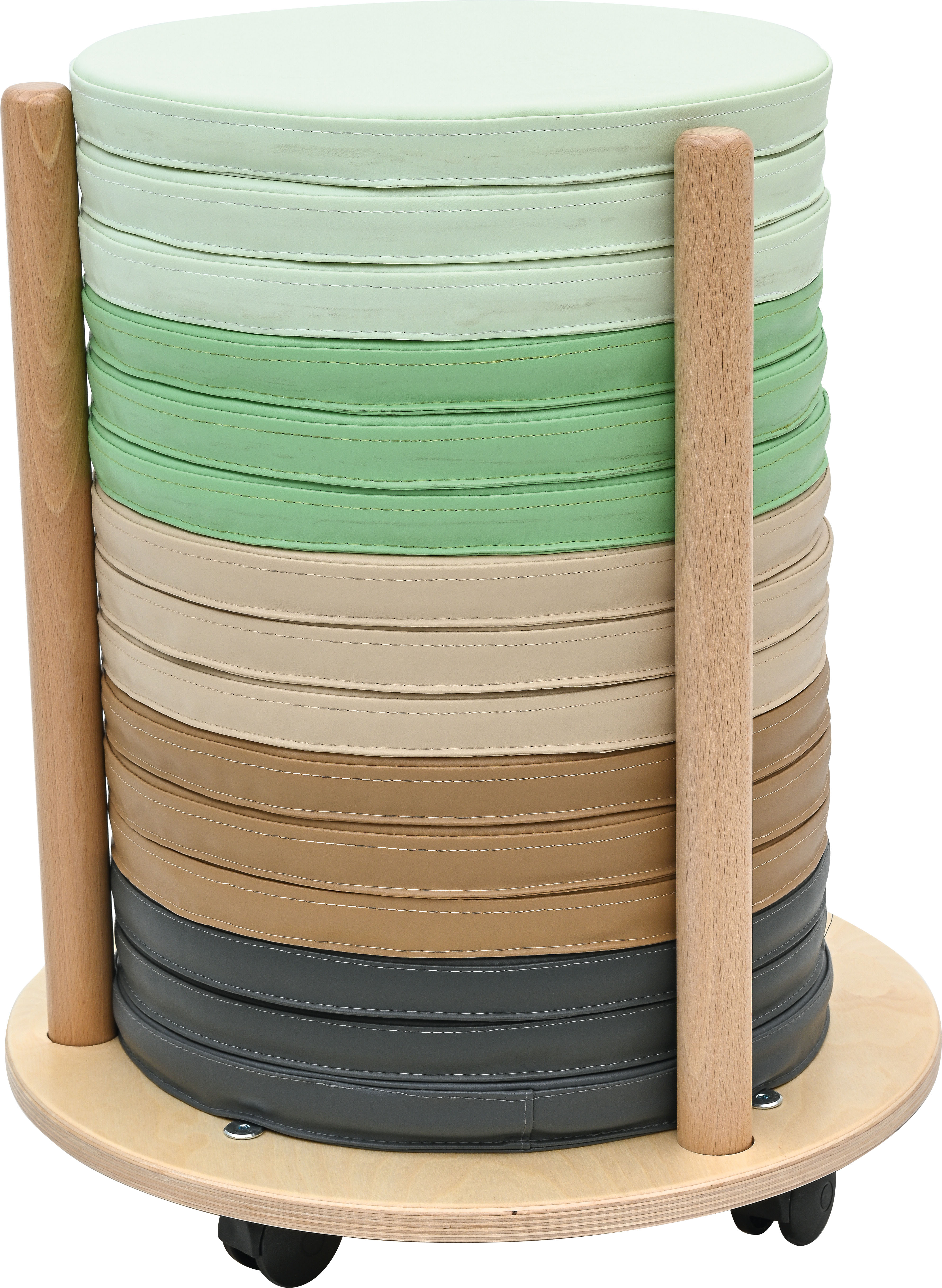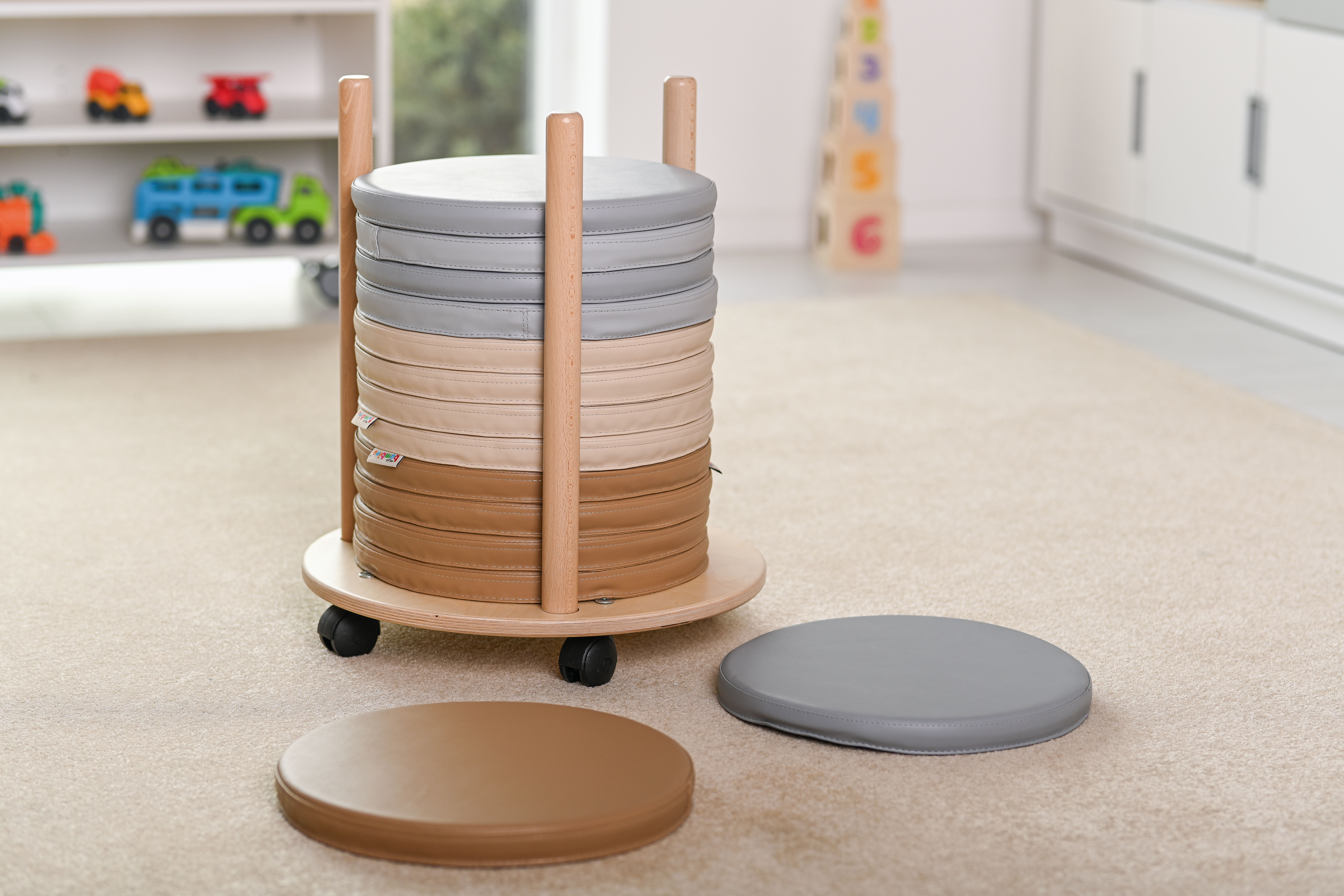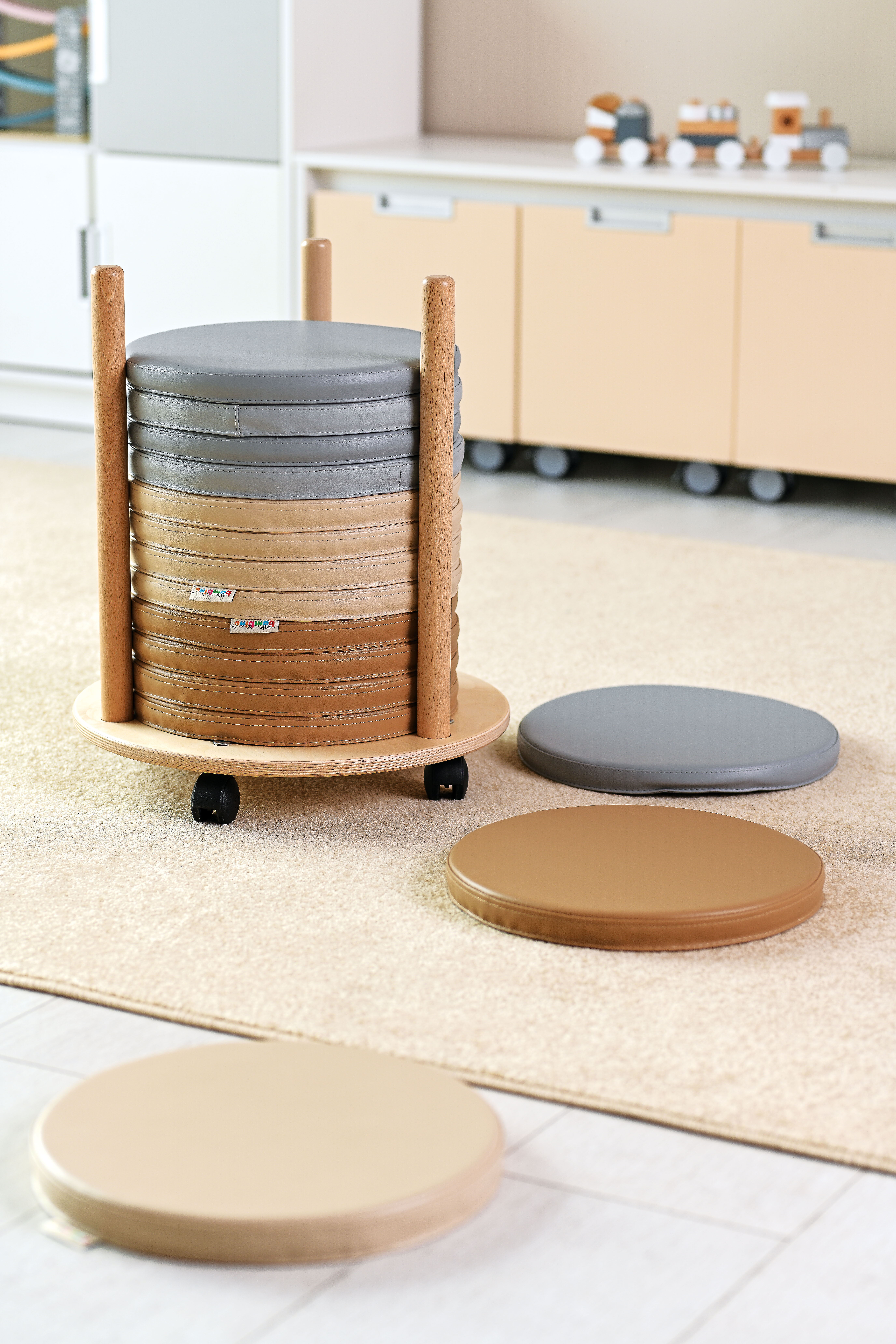 Afmeting kussens: rond 35 cm en dikte 3 cm.