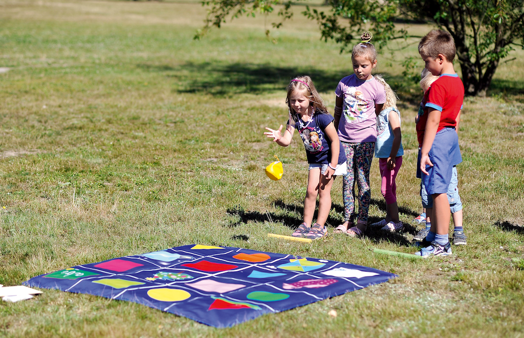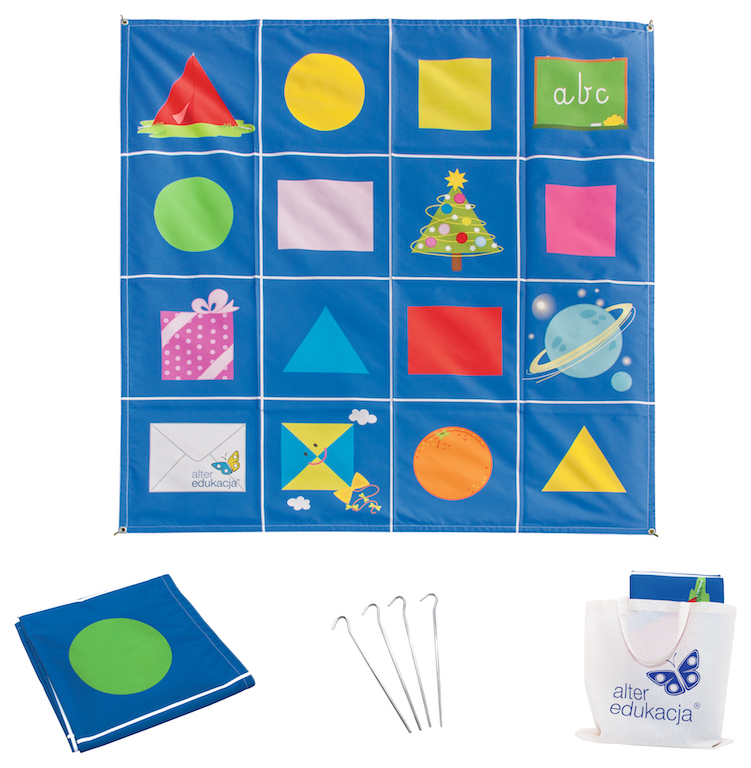 Dankzij de stalen pinnen die bij de set worden geleverd en de speciale gaten in het kleed, kan het stevig aan de grond worden bevestigd, bijvoorbeeld op het gras.