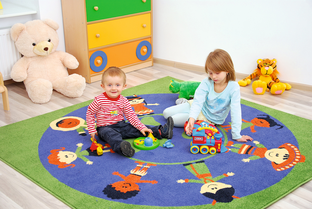 De cirkel gevormd door de personages op het tapijt kan een plek zijn waar kinderen omheen zitten.