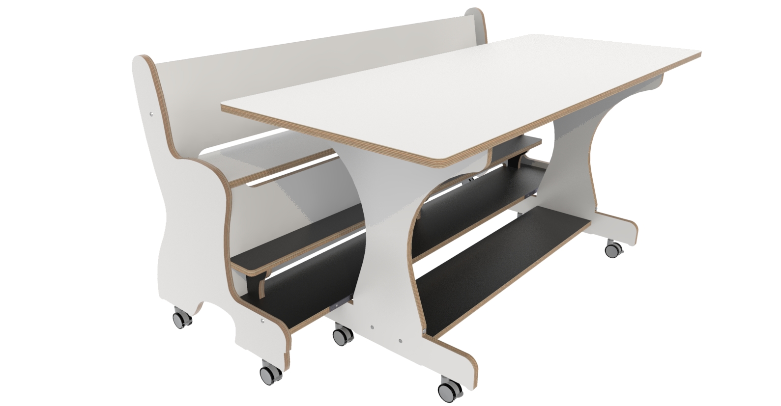 Hoogzit tafel L150 x B64 cm wit met Grey craft oak met bank Tangara Groothandel voor de Kinderopvang Kinderdagverblijfinrichting