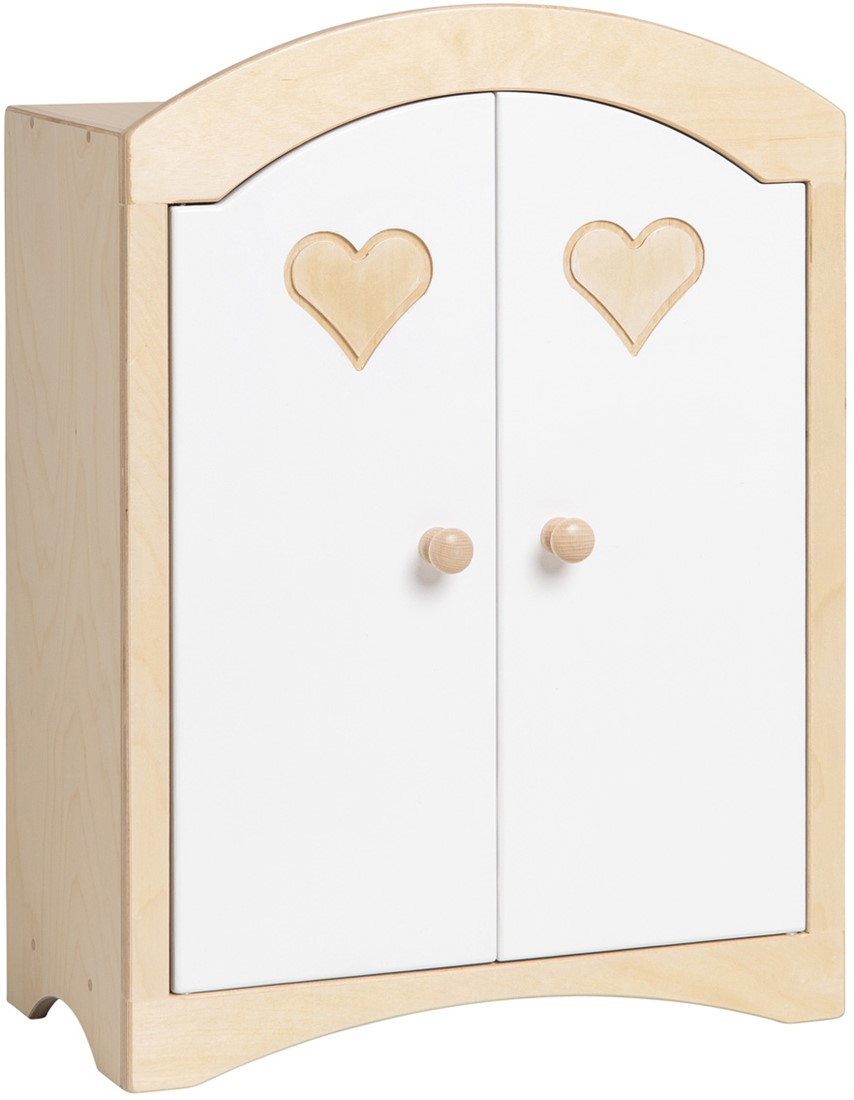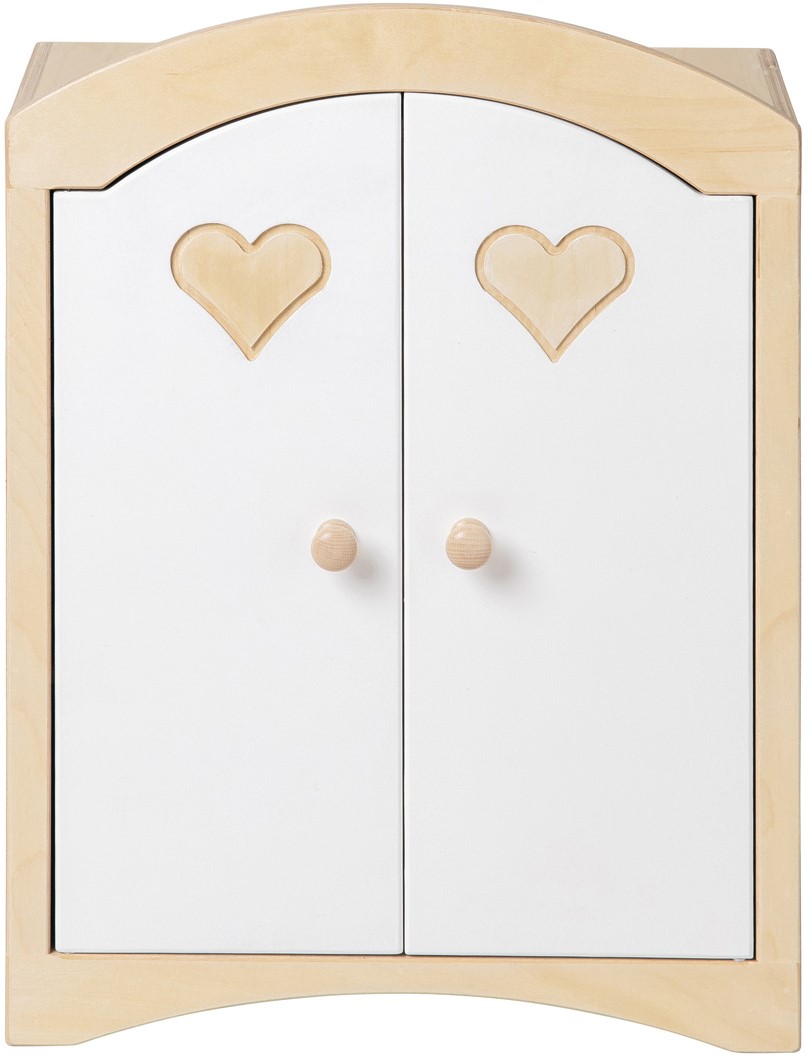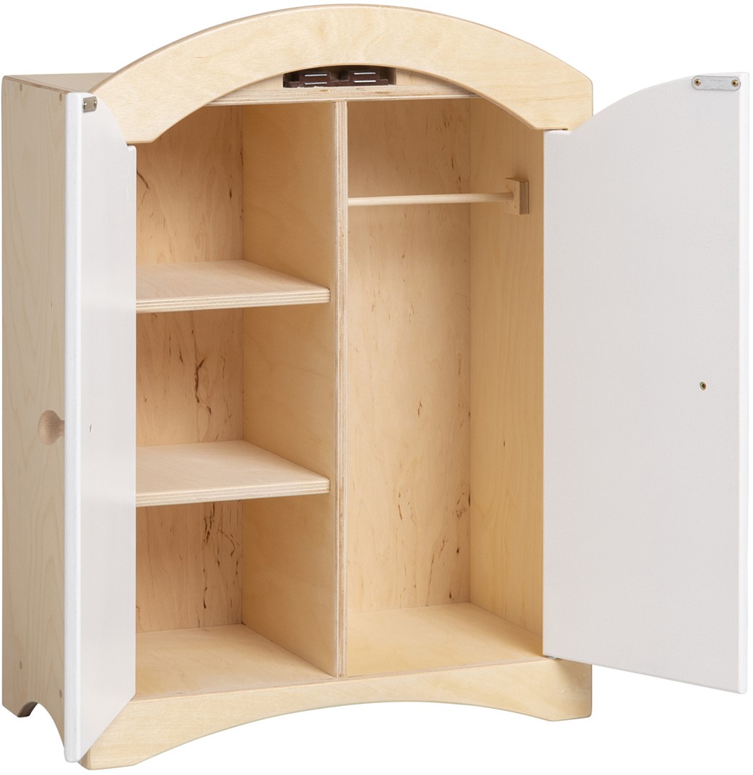 Deze poppenkledingkast heeft rechts een hanggedeelte en links een leggedeelte met 2 planken.