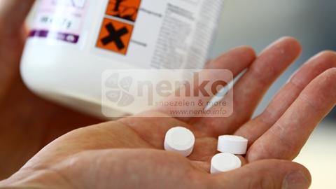 1 tablet van 1,8 gram per 10 liter water (dit kan in het begin onaangenaam ruiken).