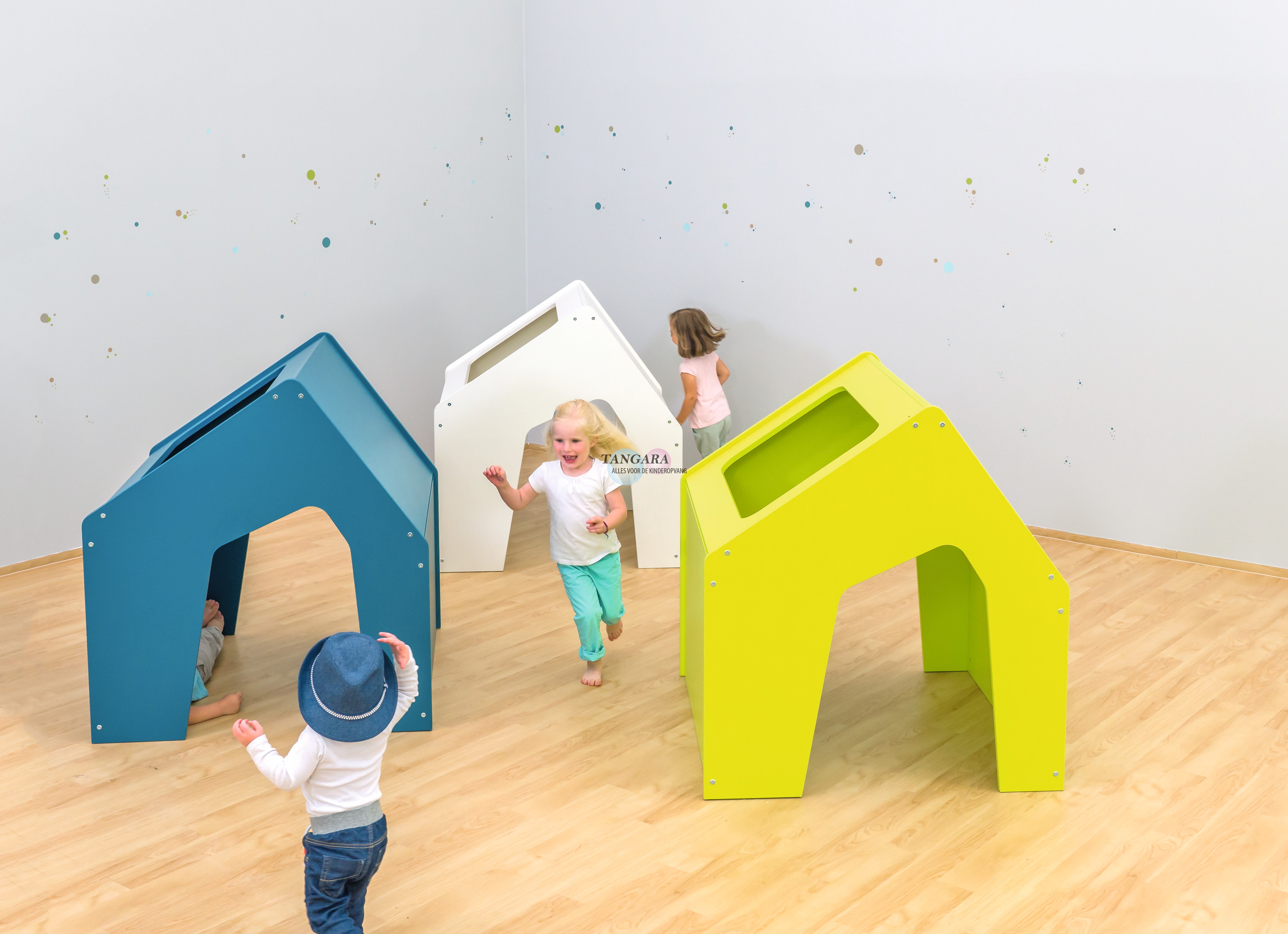 De kinderen kunnen door de huizen kruipen, hun eigen speelwerelden creëren.