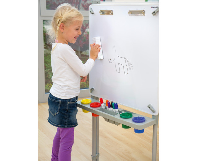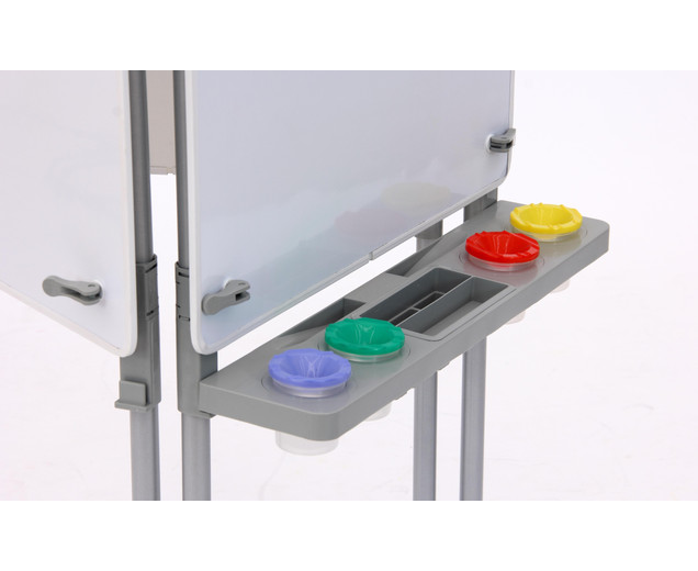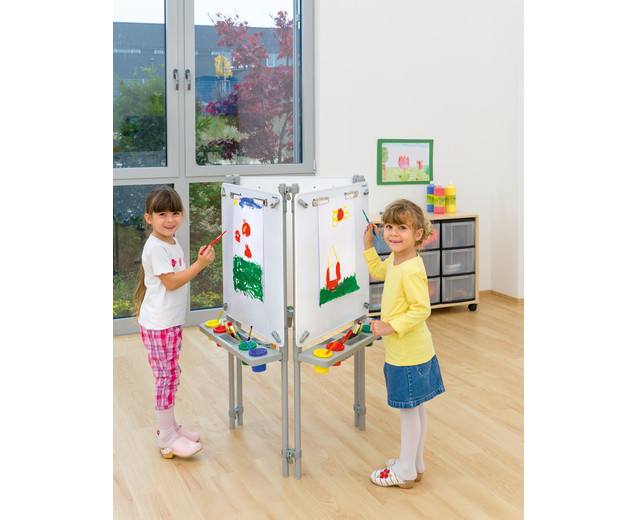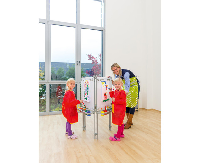| schilders ezel 3 zijdig Hier ontstaan kunstwerken hoogte verstelbaar met verfbekers inclusief montage-instructies In hoogte verstelbare schildermuur voor uw faciliteit Wie wordt de nieuwe Picasso? Drie tot zes kinderen kunnen tegelijkertijd hun ideeën op papier zetten op de 116 cm hoge schilderijmuur. Ze kunnen ideeën uitwisselen en van elkaar leren. Elk kind werkt op zijn eigen schilderijoppervlak van 60,5x60,5 cm, dat is voorzien van vier verfpotten en een penseelsteun . Dit is afneembaar en kan in de vaatwasser worden gereinigd. De hoogte van elk schilderijoppervlak kan individueel worden aangepast aan de grootte van elk kind . Gebruik de verfmuur met de volgende eigenschappen: - Verfmuren zijn magnetischen kan worden geverfd met whiteboardmarkeringen en weer worden afgeveegd - elke verfmuur heeft twee clips om op papier te houden. - Onder elk verfoppervlak bevindt zich een verwijderbaar inzetstuk voor vier verfbekers en opbergruimte voor penselen, pennen, etc. Afmetingen (L x B x H): 58 x 8,5 x 7,5 cm - Totaal metalen frame: 116 cm hoog - Afmetingen het verfoppervlak: 60,5 x 60,5 cm - het complete verfbord is in hoogte verstelbaar - inclusief water- en veiligheidskleurbekers; vier stuks per oppervlak - eenvoudig schroefmechanisme om de hoogte aan te passen en een verlenging te maken - naar wens uit te breiden - met montage-instructies Details: - Frame: aluminium - Panelen: MDF, gecoat en rubberen randen - Kleine onderdelen: polypropyleen (PP) levering - 3-zijdige schildermuur, incl. 12 verfbekers; Afmetingen: 116 x 67 x 58 cm Gegevens & feiten te gebruiken: Leeftijd vanaf:2 jaar textuur: Primair materiaal:plasticAndere materialen:metaal Afmetingen / gewicht: diepte:58 cmbreedte:67 cmheight:116 cm Algemene info: Product kleur:Wit, zilver, metaalachtig |