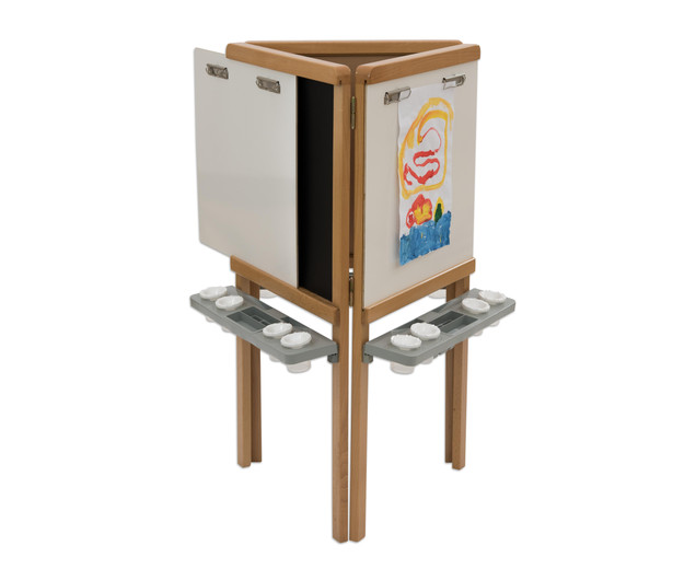 | 3-zijdige schildermuur van hout voor drie kinderen met afneembare lade Whiteboard, schoolbord en schildermuur Klem het papier vast - klaar! Dit model is gewoon ingenieus en super doordacht - de 3-zijdige schildermuur is bij uitstek geschikt voor kinderen tussen 3 en 10 jaar. Drie kinderen kunnen tegelijkertijd creatief worden op een werkhoogte van 55 cm. Door de verschillende oppervlakken, zoals whiteboard en magnetisch bordoppervlak , kunnen kinderen ervaring opdoen met verschillende soorten applicatietools (idealiter krijtbord- en whiteboardmarkers) en creatief worden op papier met vingerverf op een oppervlak van ongeveer 60 x 60 cm . Metalen connectoren verbinden eenvoudig de drie zijden met elkaar. Het whiteboard-paneel kan door de schuifstrip uit het frame worden verwijderd en heeft 2 aansluitstrips per oppervlak voor het bevestigen van papier . Het praktische dienblad kan worden verwijderd en in de vaatwasser worden gereinigd. Het wordt gebruikt om 4 verfpotten op te slaan incl. Dop , borstels, pennen en meer Details: Afmetingen (H x B x D): 15 x 60 x 60 cm Materiaal: hout, MDF, kunststof Gewicht: 18 kg Hoogte onderrand Verfoppervlak: 55 cm levering - 3-zijdige schildermuur - 3 kleurenladen - 12 kleurenbekers met dop - Montage- instructies - Bevestigingsmateriaal Gegevens & feiten te gebruiken: Leeftijd vanaf:3 jaar textuur: Primair materiaal:houtAndere materialen:Kunststof, metaal, MDF Afmetingen / gewicht: diepte:60 cmbreedte:60 cmheight:115 cm |