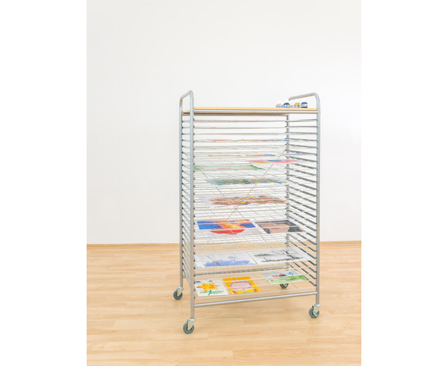 | De grote droogwagen 25 grote droogroosters flexibel instelbaar dankzij vier rollen voor afbeeldingen met formaten tot DIN A1 De grote Betzold foto-droogwagen voor veel kleurrijke foto's Op de grote Betzold foto-droogwagen kun je veel natte foto's drogen zonder te verdwalen en zonder naar beneden te glijden. De Betzold-droogkar voor afbeeldingen is uitgerust met 25 droogroosters, die met geleiderails aan de zijkanten gemakkelijk in en uit kunnen worden geschoven. De afzonderlijke rasters bieden ruimte voor foto's tot het formaat DIN A1. Hierdoor kan de auto tegelijkertijd tot 100 A4-formaat afbeeldingen drogen. Flexibel en altijd waar u het nodig hebt Veel kleine kunstwerken en te weinig ruimte. De droogwagen kan flexibel in elke ruimte worden geplaatst en ook bruikbaar als toonbank voor andere ambachten. Details Afmetingen (H x B x D): 153 x 94 x 60 cm Maaswijdte: 11,5 x 14,7 cm De afstand tussen de bodems is 4,5 cm Gegevens & feiten te gebruiken: Leeftijd vanaf:6 jaar textuur: Primair materiaal:metaalAndere materialen:Hout, rubber, kunststof Afmetingen / gewicht: diepte:60 cmbreedte:94 cmheight:153 cmTotaal gewicht:45 kg Algemene info: |