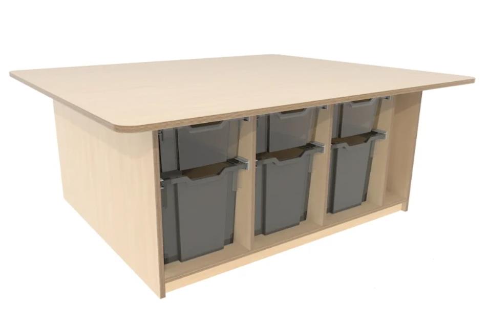 Grote bouwtafel voorzien van 6 grote H30 en 6 mediumgrote H15 transparante lades verdeeld aan beide kanten,
