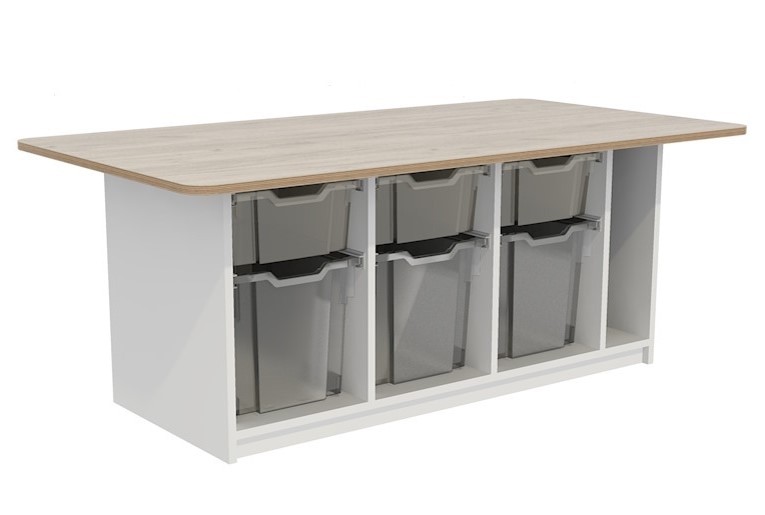 Compacte bouwtafel voorzien van 3 grote H30 en 3 mediumgrote H15 transparante lades,