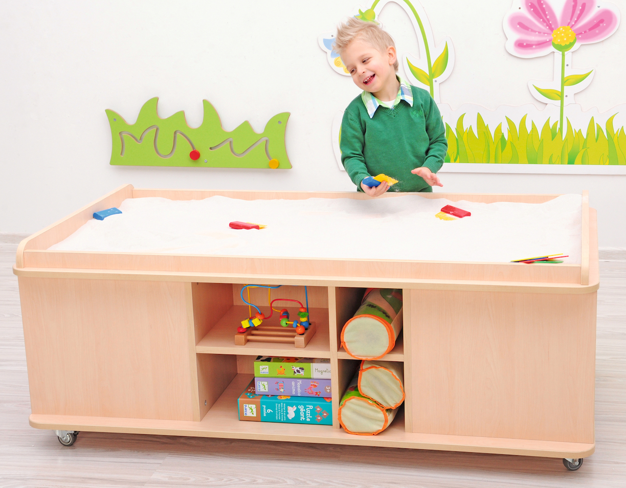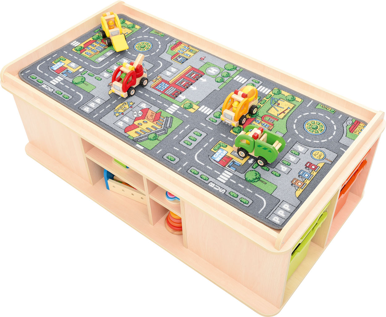 Speeltafel voorzien van legplanken en nissen voor het opbergen van speelmatten.