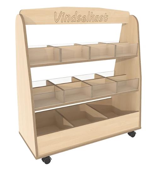 Verrijdbare kast om allerlei gevonden materiaal of 'loose parts' tentoon te stellen.
