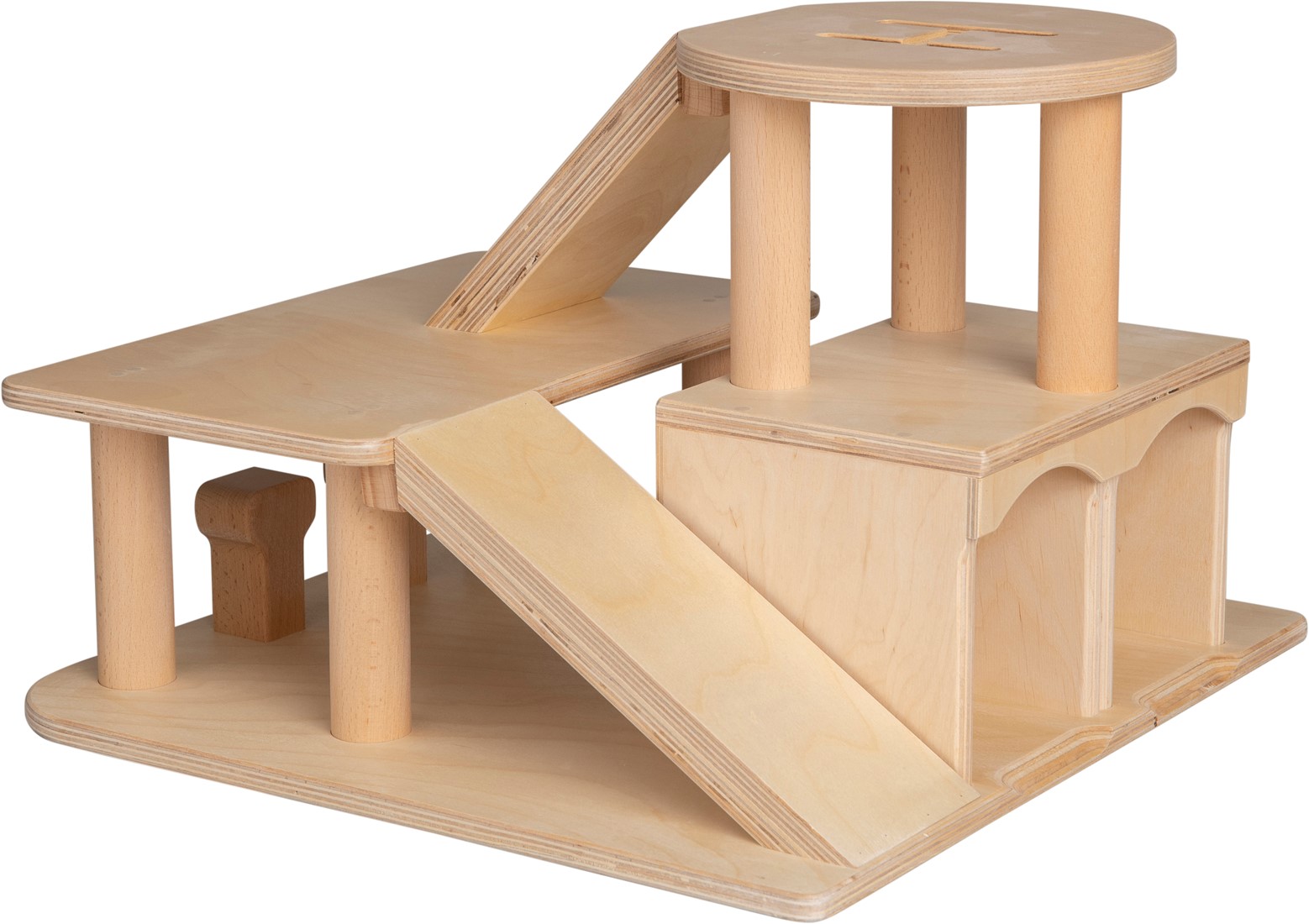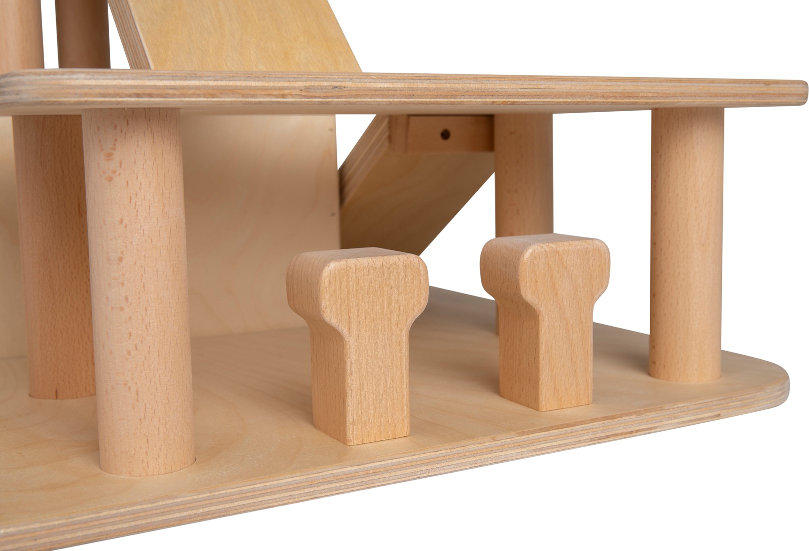 De twee ruime garage openingen leren de kinderen auto's te parkeren, wat de motoriek ten goede komt.